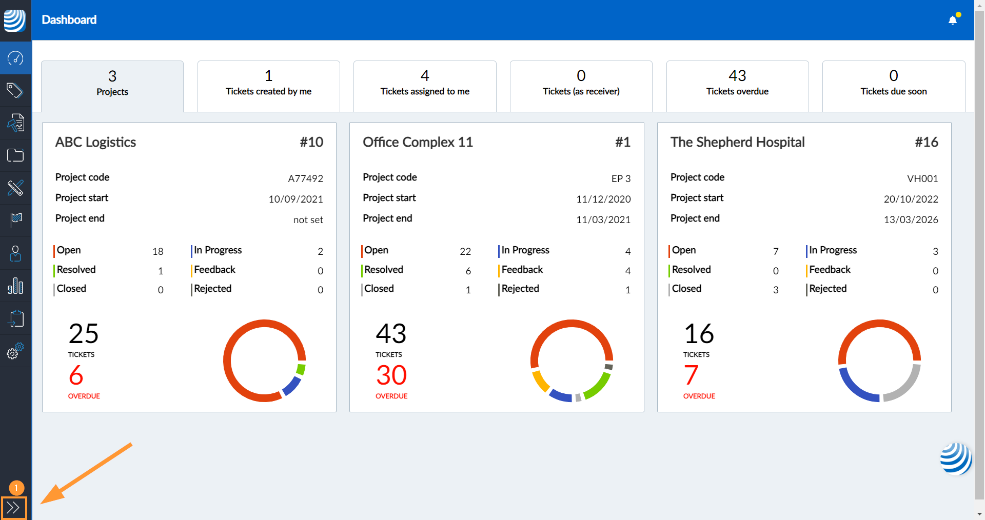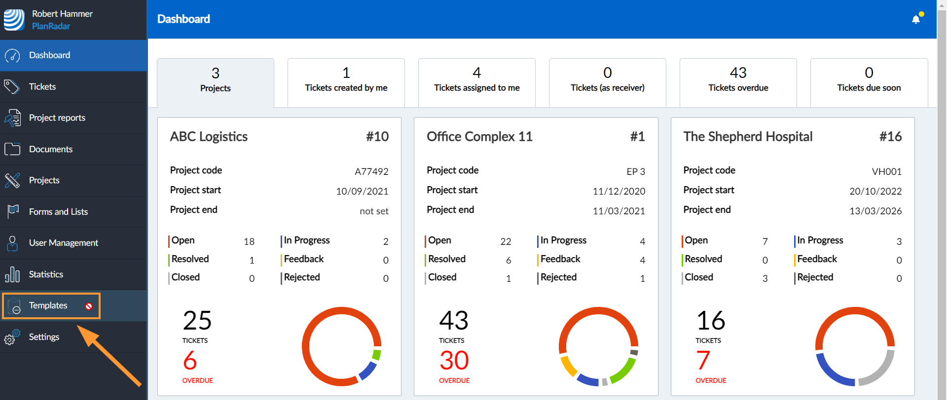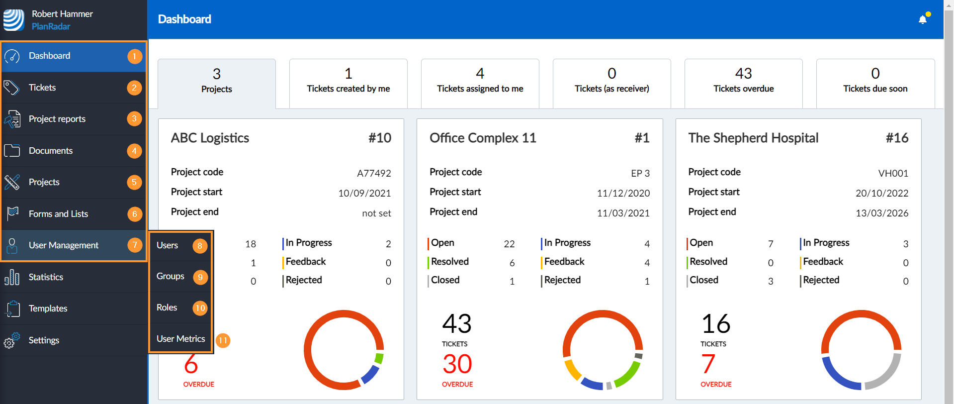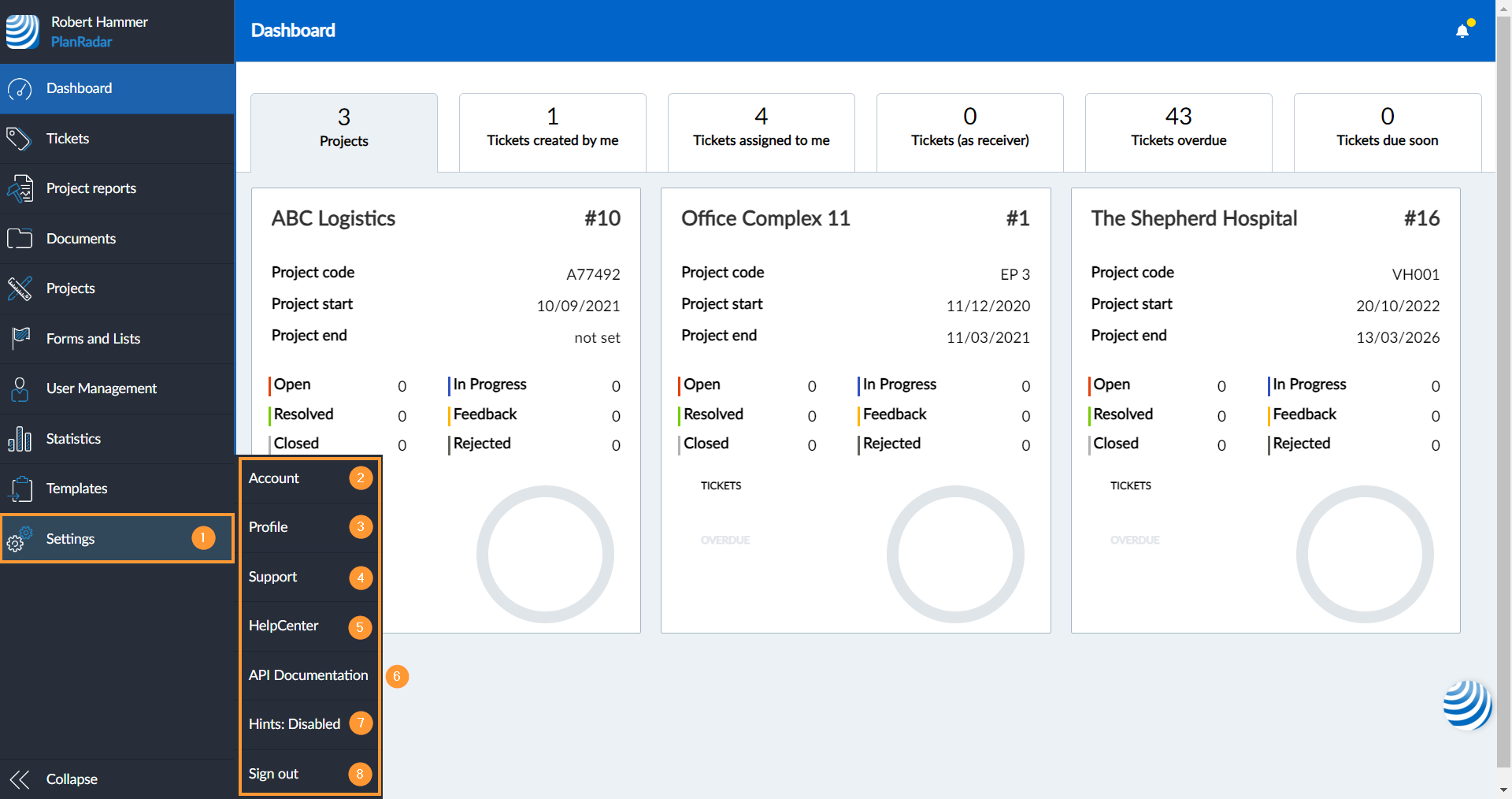 Verwenden Sie das Hauptmenü auf der linken Seite, um zu den jeweiligen Funktionen der PlanRadar Webapp zu springen, den Account zu wechseln, zu den Einstellungen zu gehen oder sich abzumelden.
