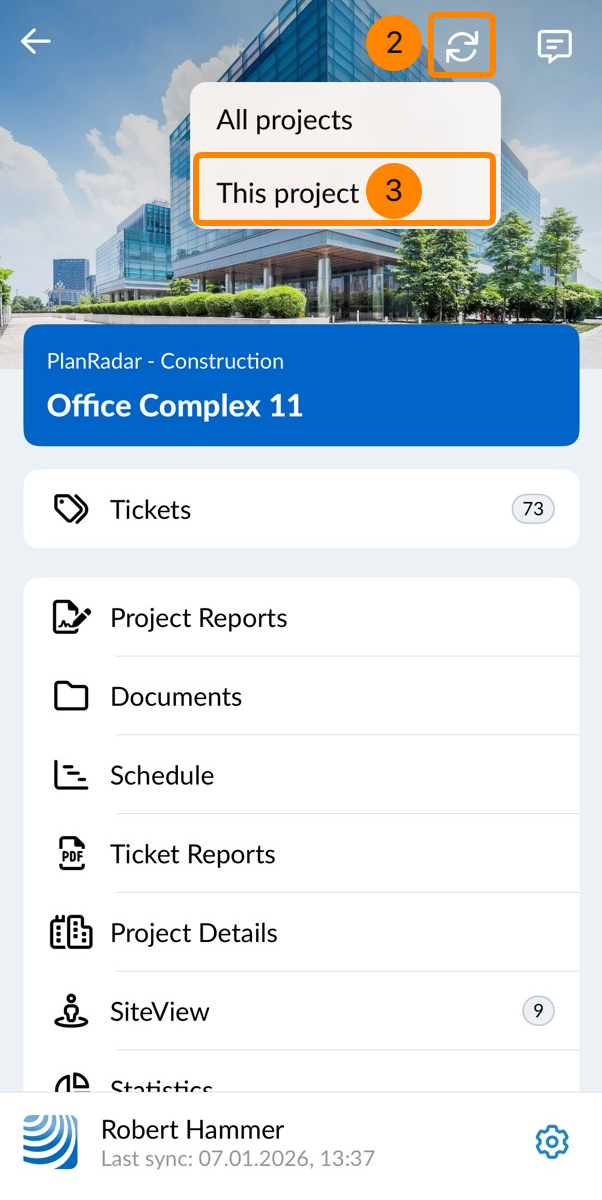 Sie müssen auch darauf achten, dass Sie Ihre Daten regelmäßig synchronisieren, um sicherzustellen, dass Sie die neuesten Daten auf Ihrem Gerät haben. Dies ist besonders wichtig, wenn Sie damit rechnen, dass Sie an dem Ort, an dem Sie die PlanRadar App verwenden möchten, eine schlechte oder keine Internetverbindung haben. Bei der Synchronisierung Ihrer App werden alle Projektdaten, einschließlich Tickets, Ticketanhänge und Pläne, in Ihre mobile App heruntergeladen.