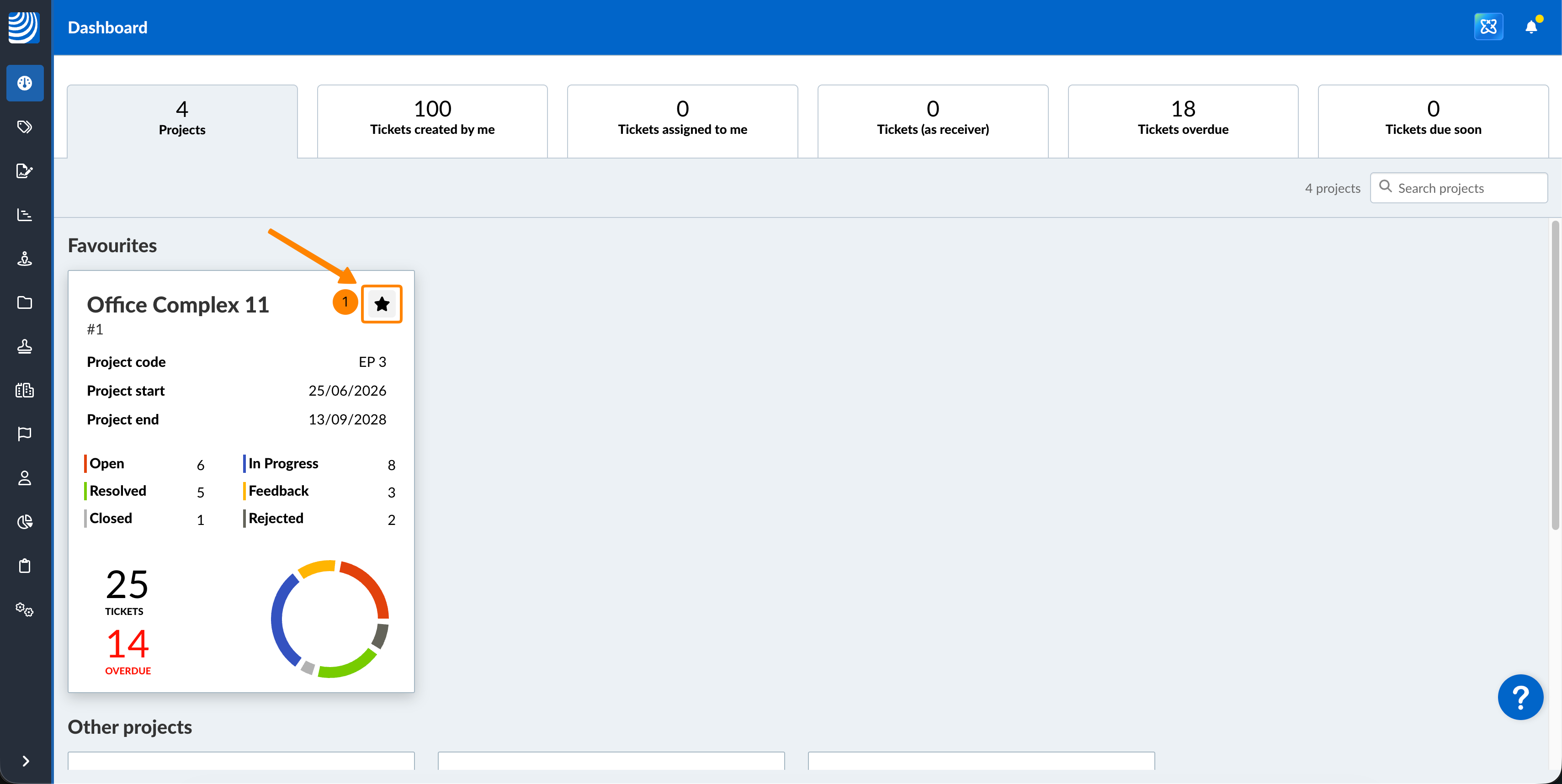 Fügen Sie Projekte zu Ihren Favoriten hinzu, wenn sie Ihnen derzeit wichtig sind. Sie werden dann auf dem Dashboard über anderen Projekten aufgeführt.
