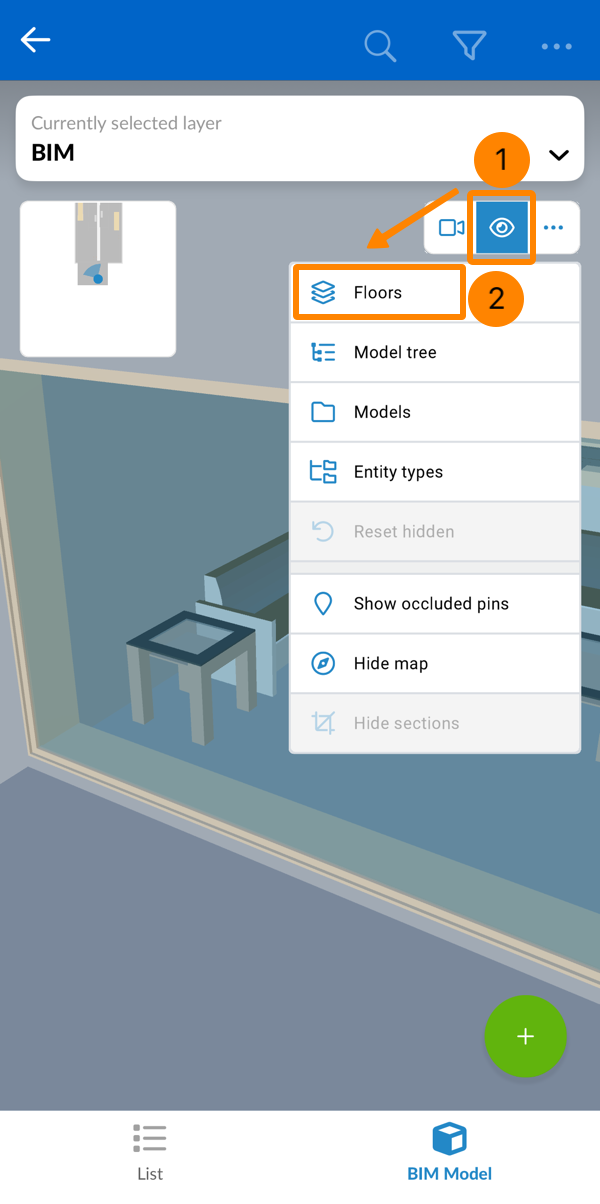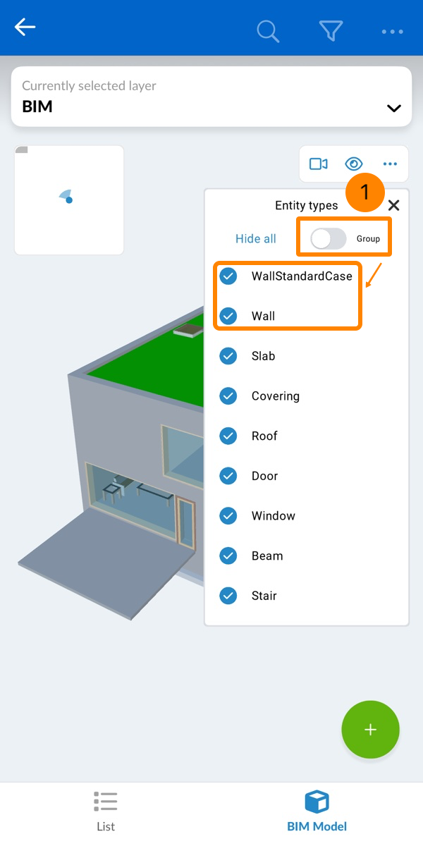 - Tippen Sie auf eine Ebene mit einem BIM-Modell (gekennzeichnet durch ein Würfelsymbol)