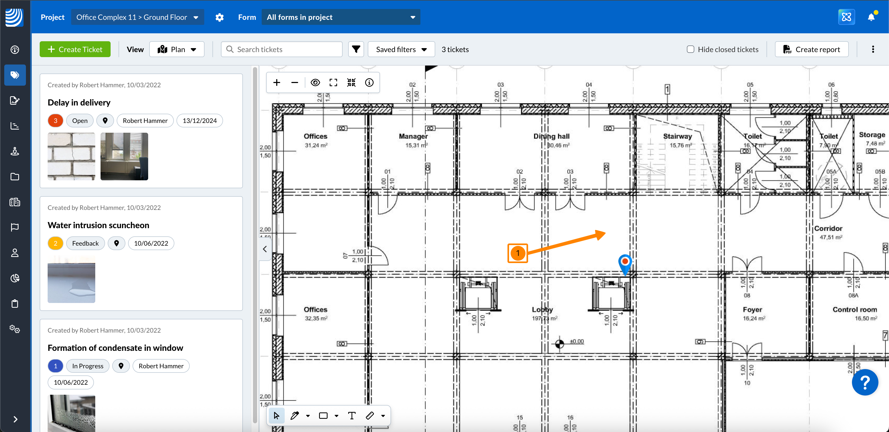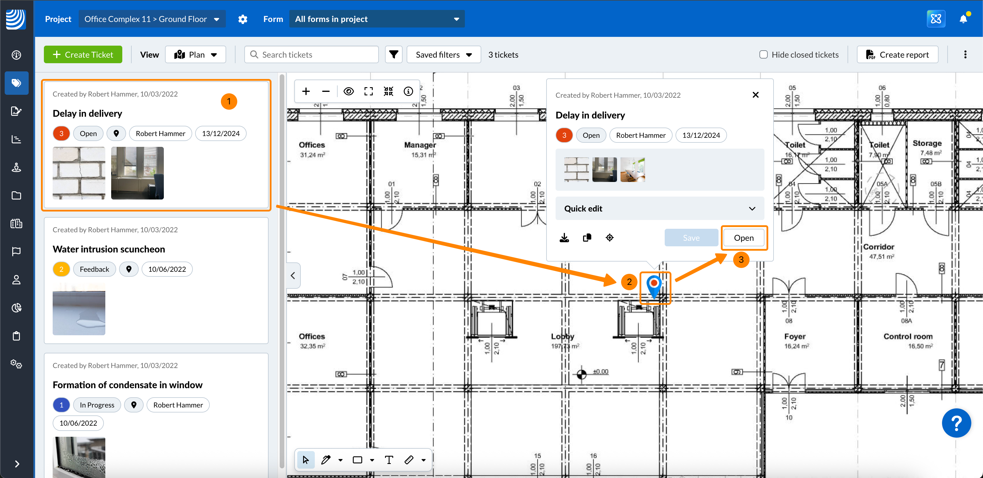 - Klicken Sie auf das Ticket in der Ticketliste, um den Ticket-Pin automatisch auf dem Plan anzuzeigen und die Ticketvorschau zu öffnen.