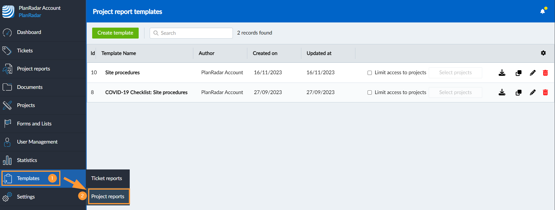 Sie können Ihr eigenes maßgeschneidertes PDF-Formular hochladen oder eines der vorgefertigten PDF-Formulare verwenden, wenn Sie eine neue Vorlage erstellen. Als Teil der Vorlage müssen Sie festlegen, wer die Vorlage verwenden darf und ob und wie Fotos und Tickets angehängt werden können. Darüber hinaus können Sie Voreinstellungen für Felder definieren und Felder mit PlanRadar-Daten verknüpfen, um dynamische Dropdowns zu erstellen.