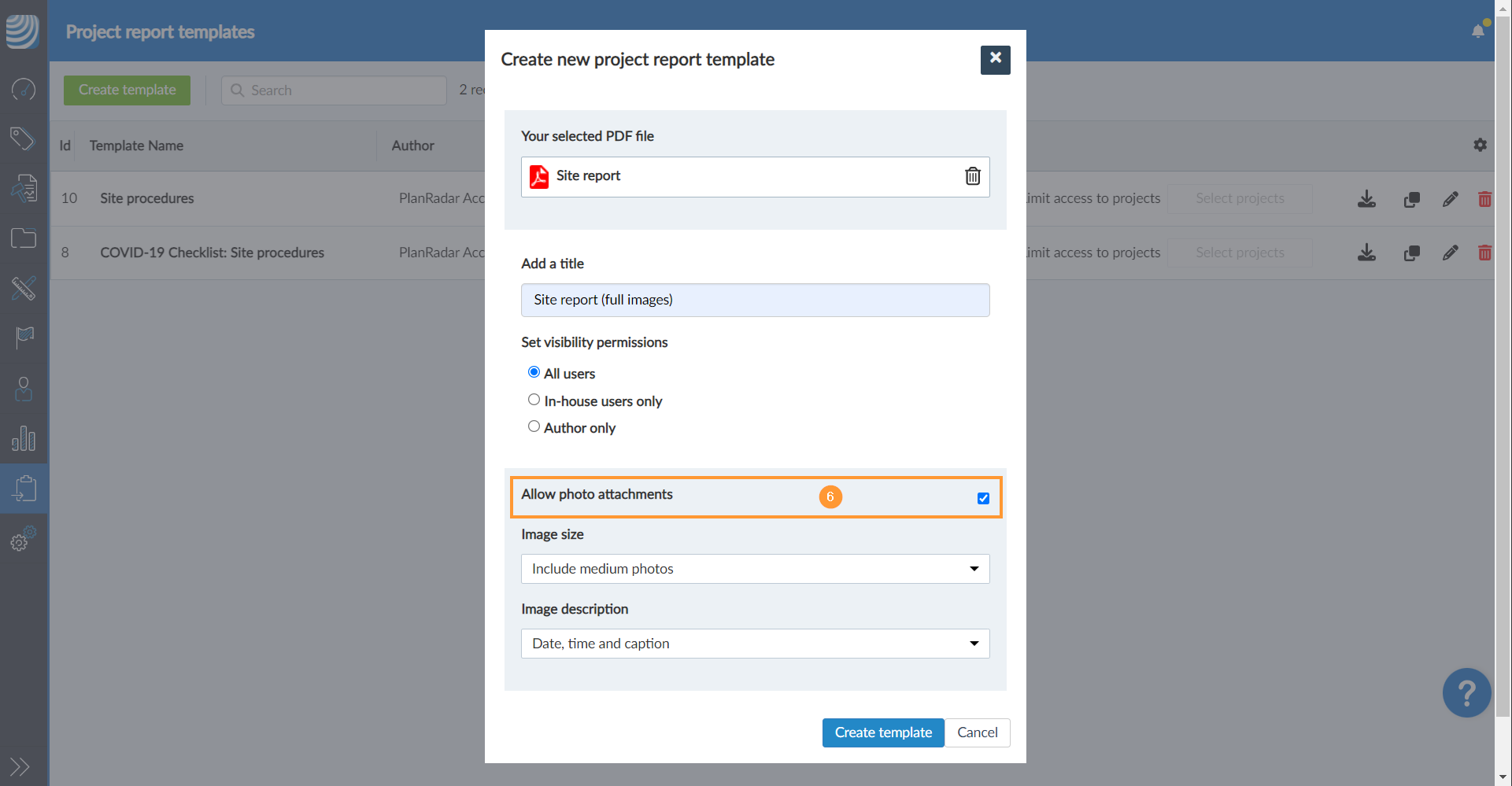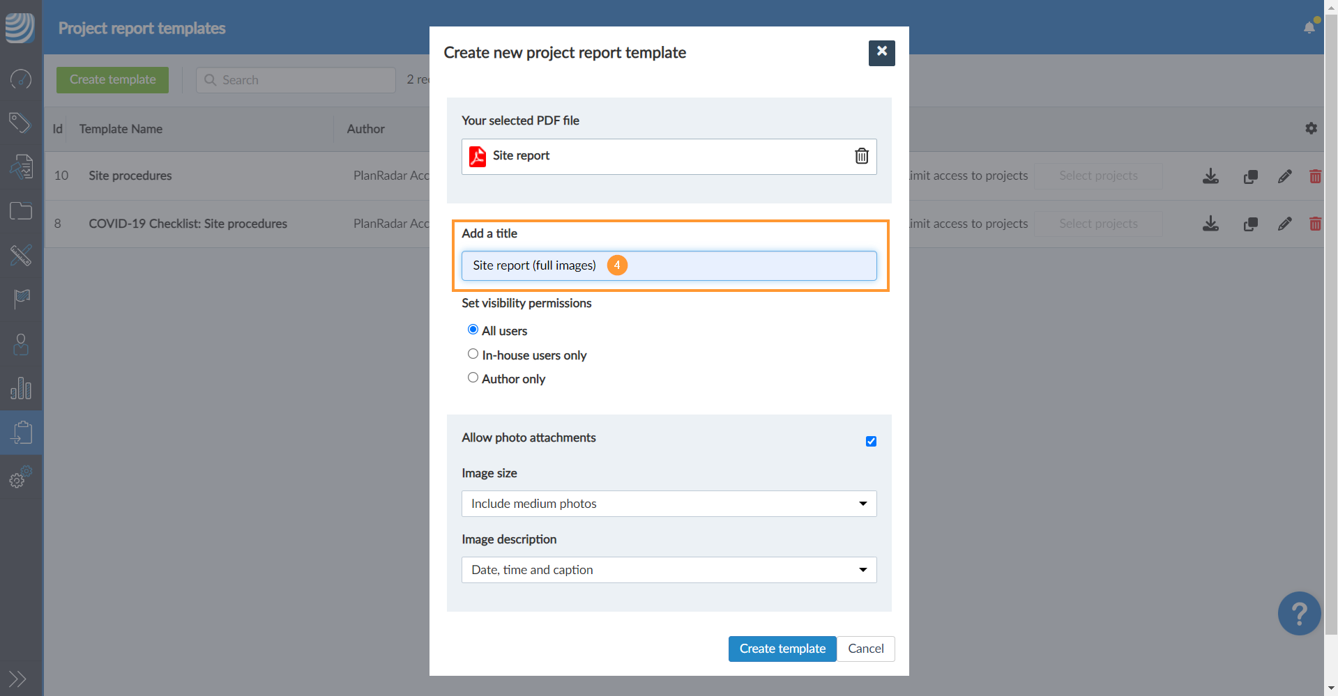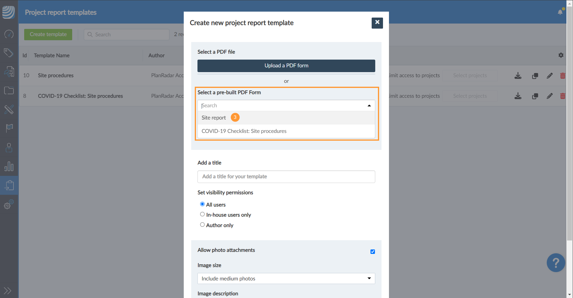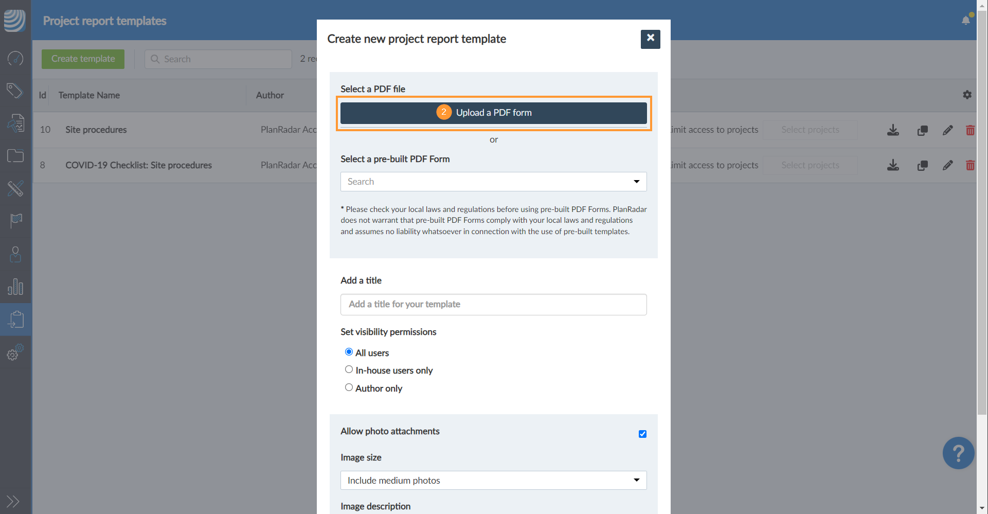 - Fahren Sie mit der Erstellung einer Projektberichtsvorlage in PlanRadar fort und laden Sie Ihr PDF-Formular hoch.