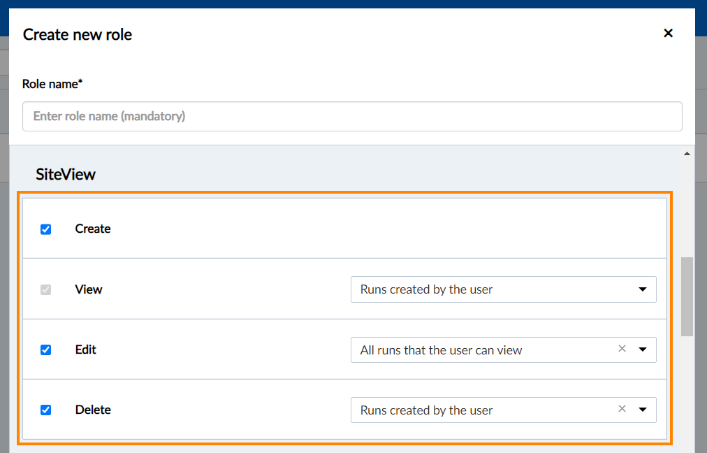 - Löschen: Berichte löschen. Verwenden Sie das Dropdown-Menü, um festzulegen, welche Projektberichte der Benutzer löschen kann.