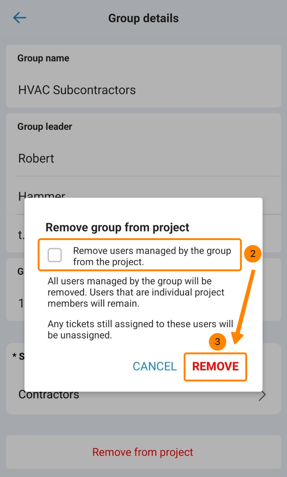 - Optional: Behalten/Löschen Sie die Benutzer die von der Gruppe verwaltet werden aus dem Projekt entfernen Checkbox.