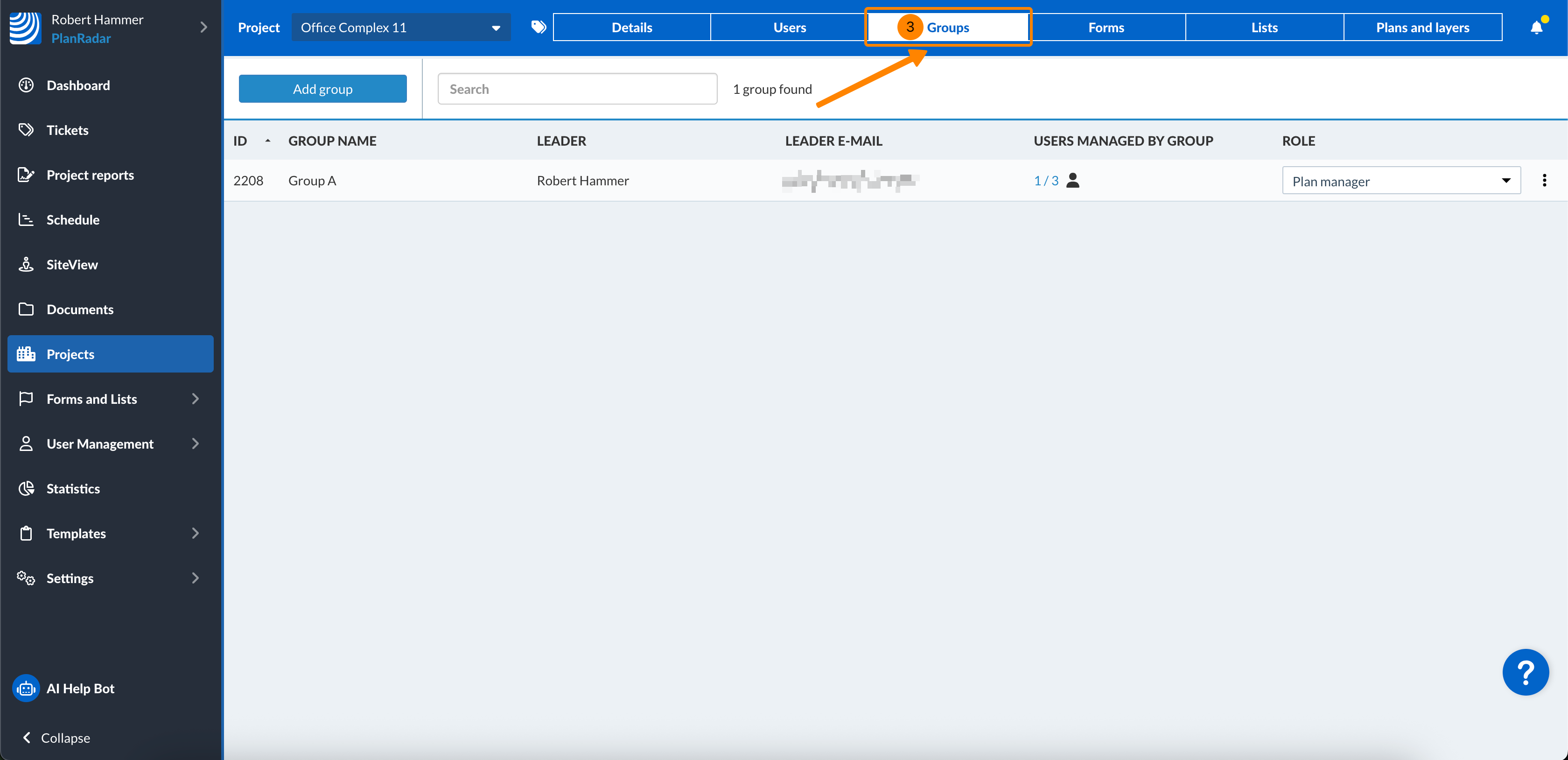 - Wählen Sie das Projekt, dessen Gruppen Sie verwalten möchten