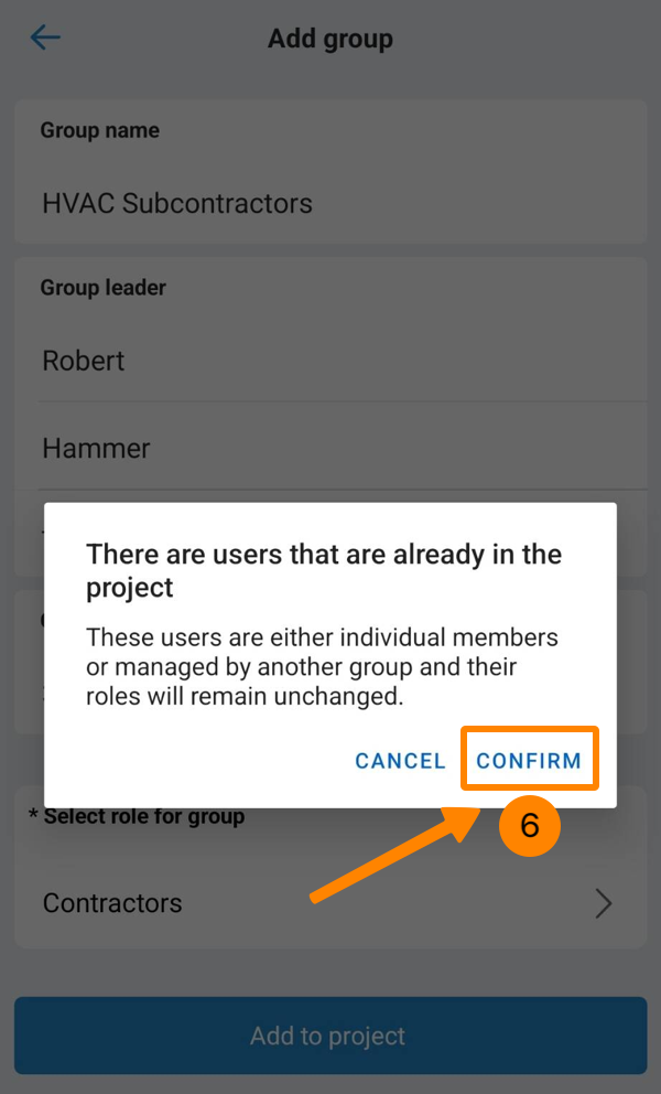 - Klicken Sie auf Bestätigen, wenn es in der/den Gruppe(n) Benutzer gibt, die sich bereits im Projekt befinden.