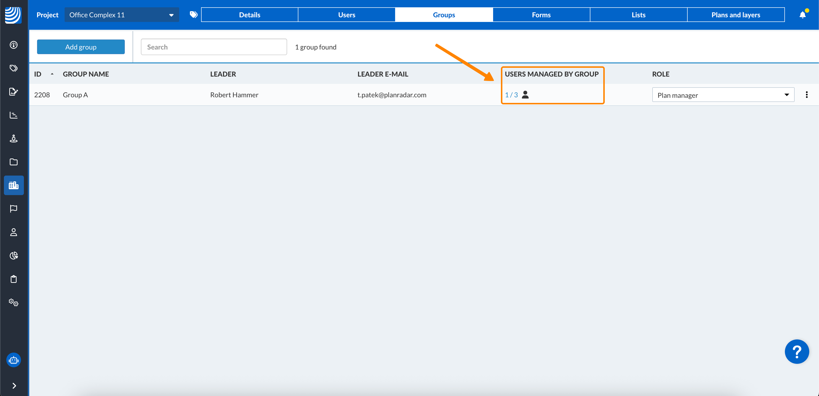 Die Spalte Benutzer, die von der Gruppe verwaltet werden, zeigt, wie viele der gesamten Benutzer dieser Gruppe in diesem Projekt von dieser Gruppe verwaltet werden.