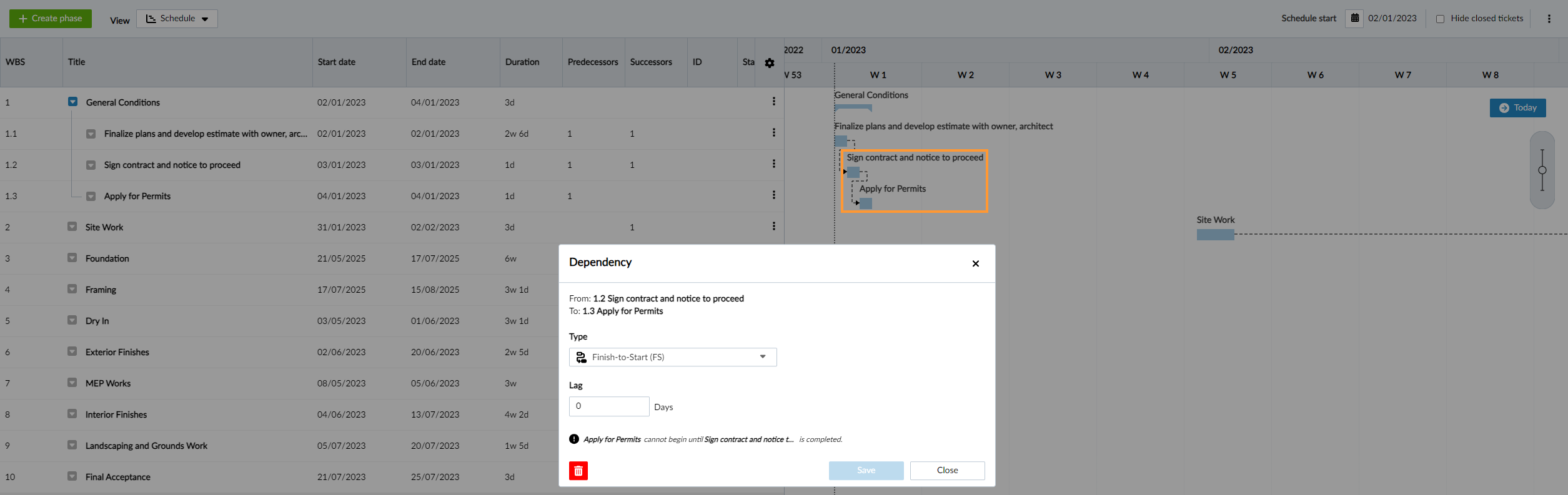 Ein Projektplan beschreibt ein Projekt als eine Abfolge von Projektphasen, die typischerweise voneinander abhängen. Mit Projektplänen unterstützt PlanRadar zwei beliebte Projektmanagementkonzepte: