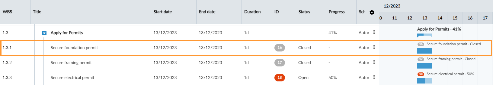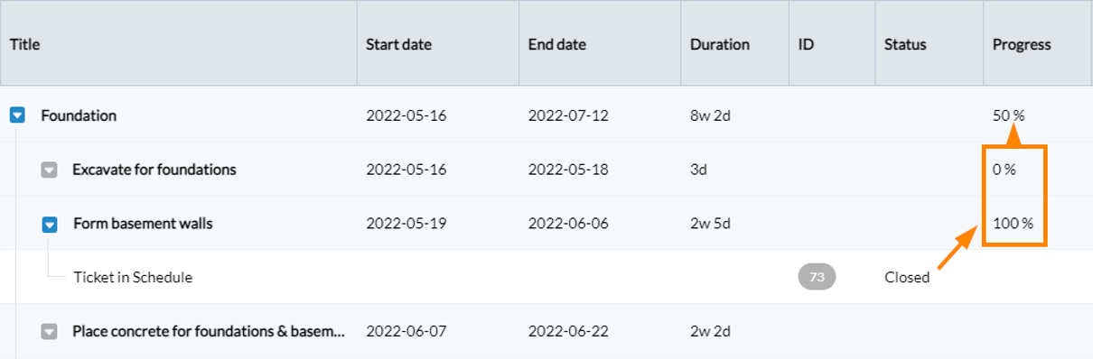 Andernfalls wird der Wert des Ticketfortschritts für die weitere Berechnung im Projektplan verwendet und der Fortschrittswert wird in der Tabelle und im Gantt-Diagramm angezeigt.