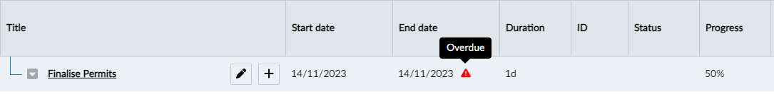 Phasen sind überfällig, wenn ihr Fortschritt nicht 100% beträgt und das Enddatum in der Vergangenheit liegt.