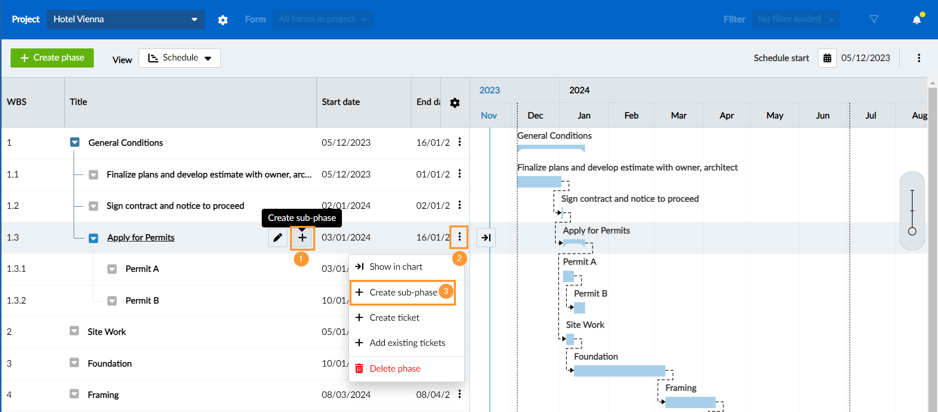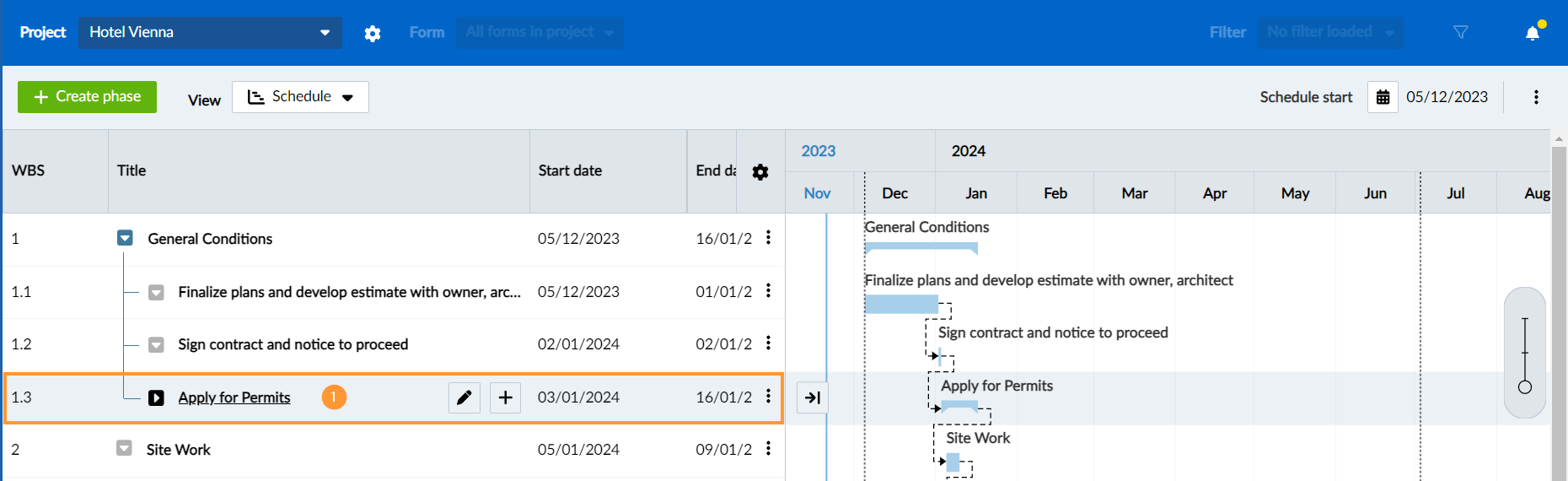 - Klicken Sie auf die Phase im Projektstrukturplan