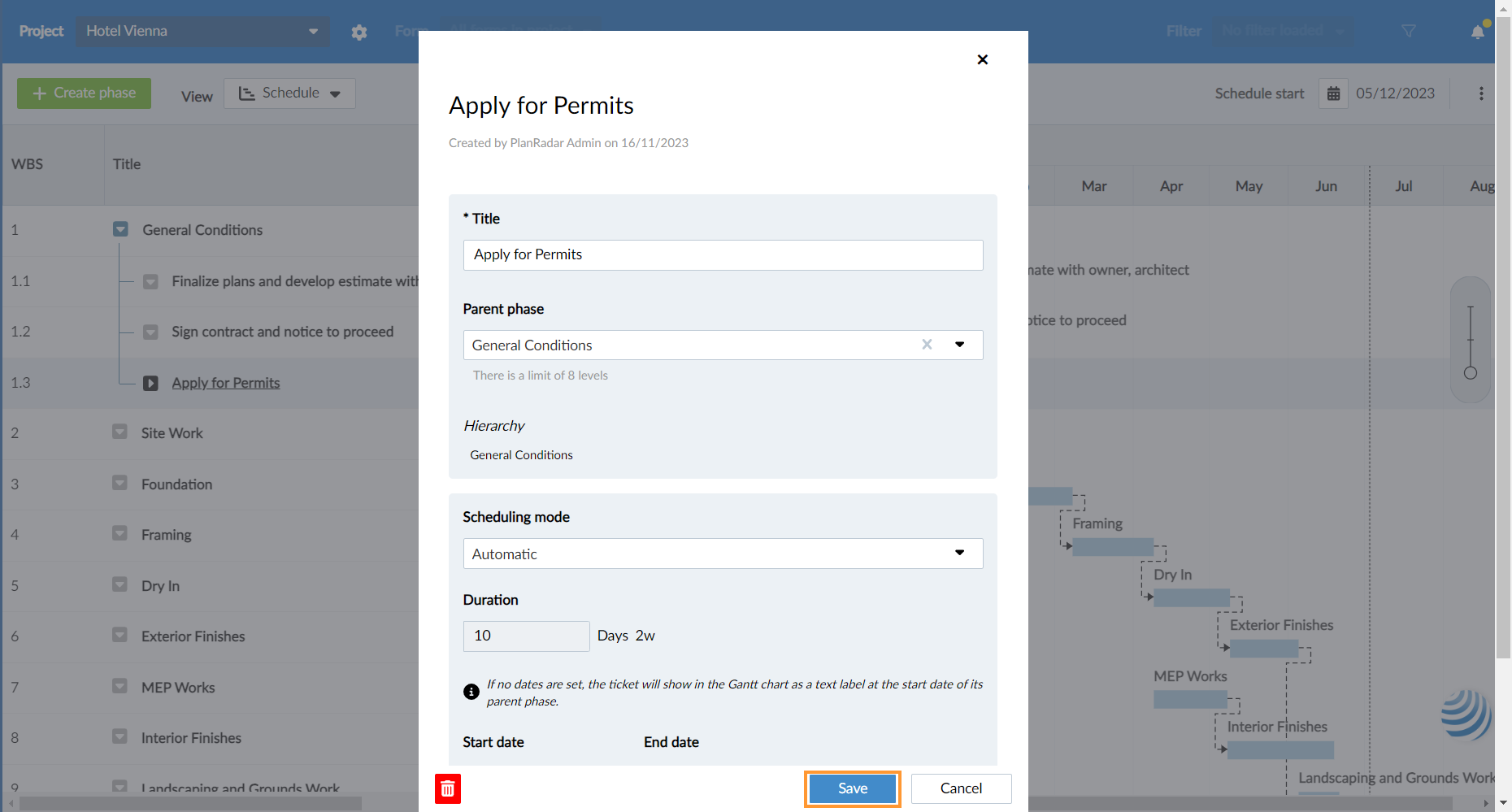 - Wählen Sie die Übergeordnete Phase, um eine untergeordnete Phase zu erstellen, oder lassen Sie das Feld leer, wenn die neue Phase auf der ersten Ebene des Projektstrukturplans (PSP) liegen soll.