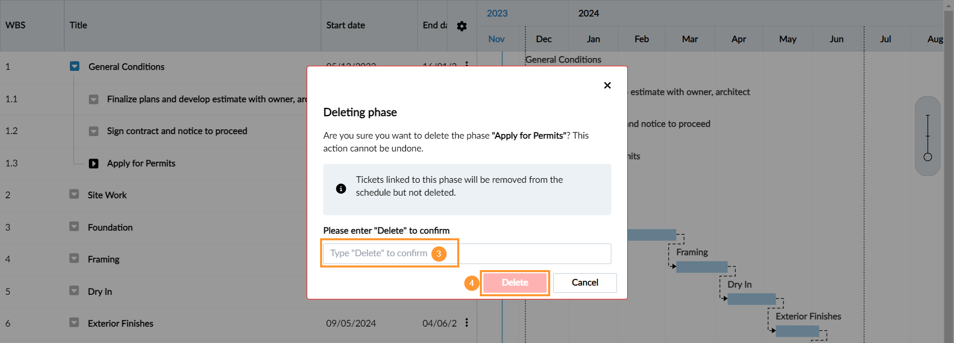 Wenn Sie eine Phase löschen, werden auch alle ihre untergeordneten Elemente gelöscht. Mit Phasen verknüpfte Tickets werden aus dem Projektplan entfernt, aber nicht gelöscht.