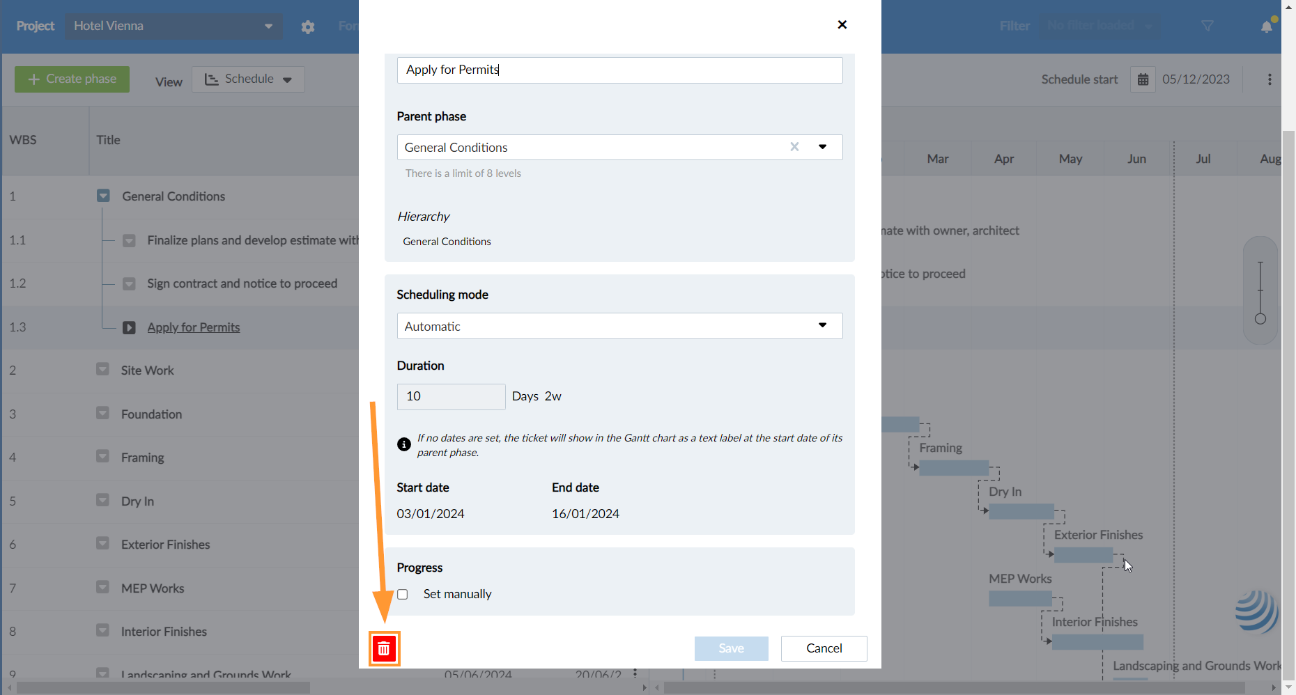 - Geben Sie 'Löschen' in das Bestätigungsfeld ein, wenn die Phase untergeordnete Elemente hat.