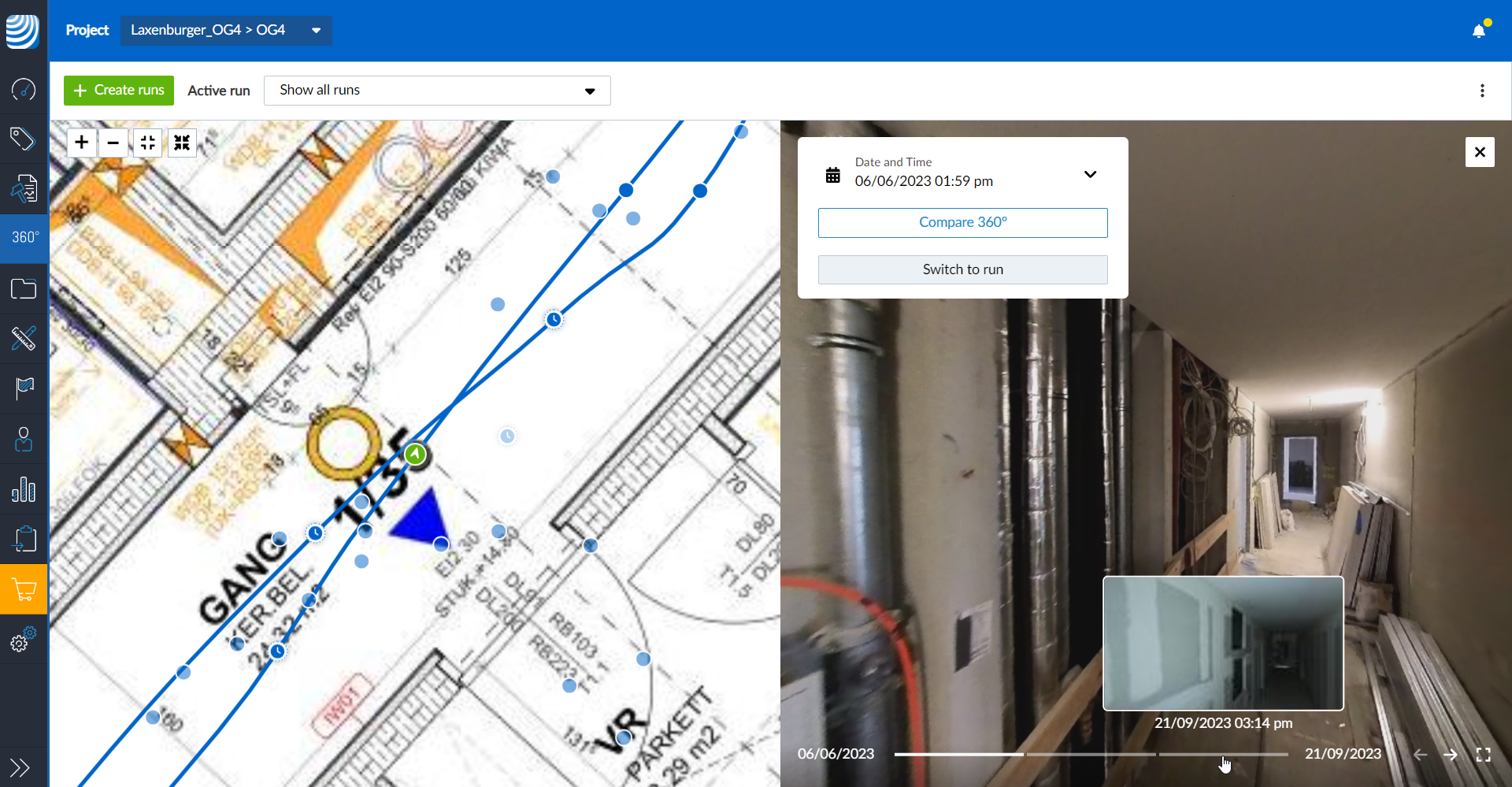 Nach der Verarbeitung können Sie durch alle 360°-Bilder navigieren und diese ansehen. Wenn Sie mehrere Aufnahmen vom selben Standort haben, können Sie verschiedene Zeitpunkte miteinander vergleichen.