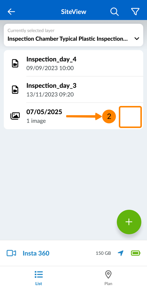 Standbilder werden automatisch nach Tagen gruppiert. Gruppen erscheinen neben Begehung in der Liste und sind mit einem anderen Symbol gekennzeichnet.