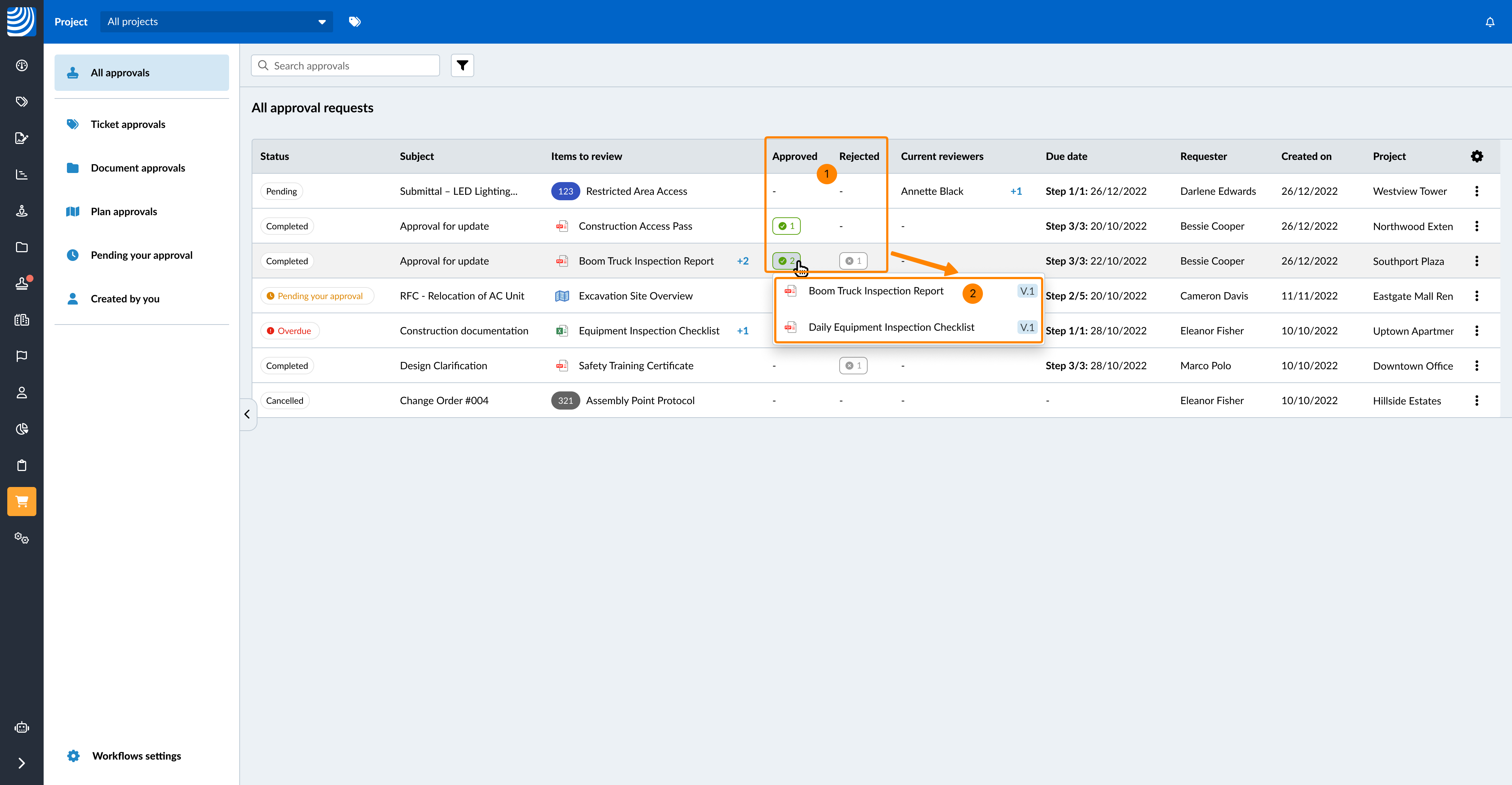 - Sie sehen die Anzahl der Freigegeben oder Abgelehnten Elemente in den Spalten für abgeschlossene Freigabeanforderungen.