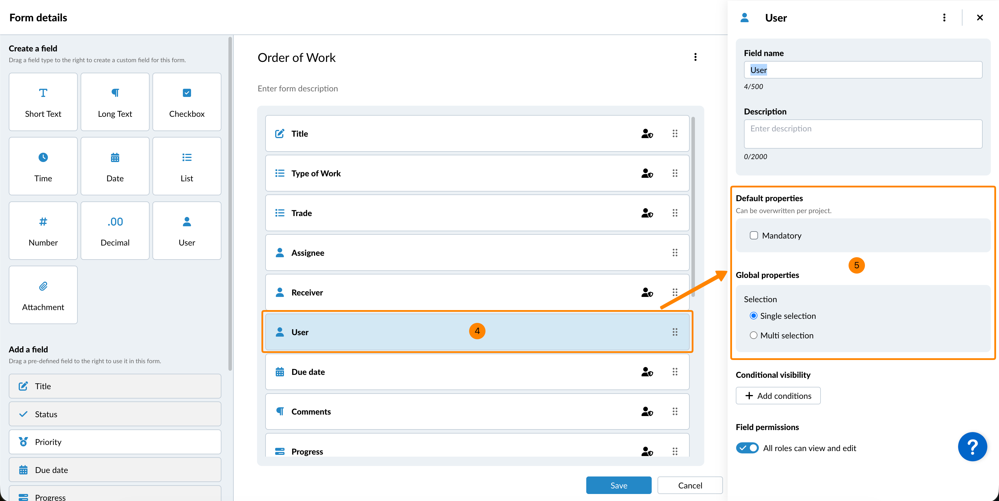 - Betrachten und bearbeiten Sie die Feldeigenschaften im rechten Seitenbereich.