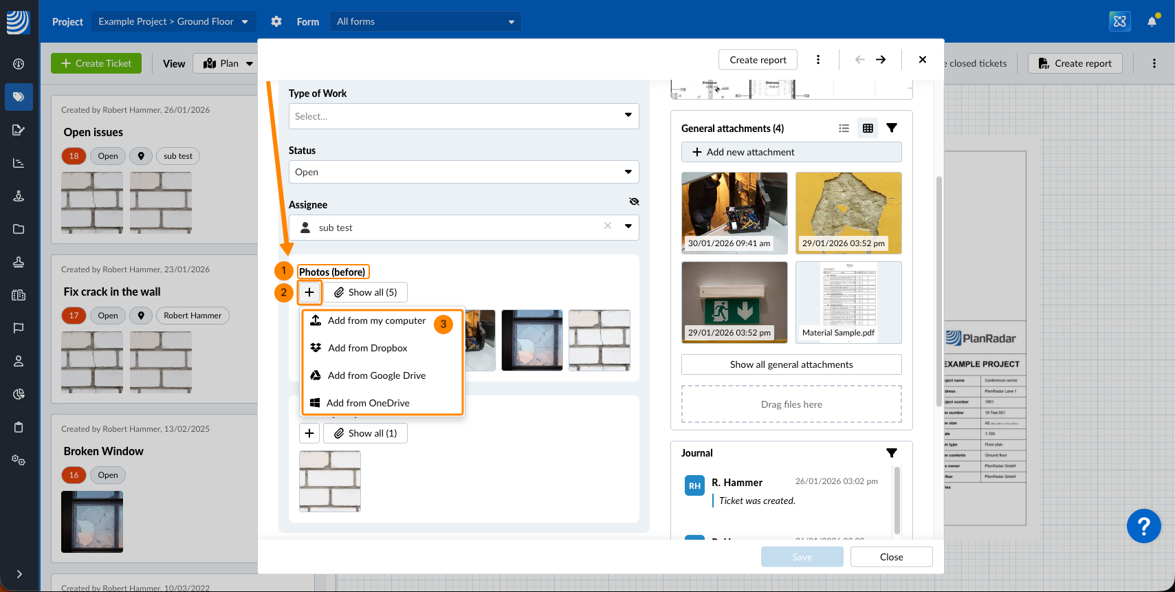 Fügen Sie beim Erstellen oder Bearbeiten von Tickets Anhänge hinzu - siehe auch Ticket erstellen oder Ticket ansehen & bearbeiten.