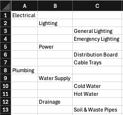 For multilevel lists use column A for level 1, column B for level 2, and so on.