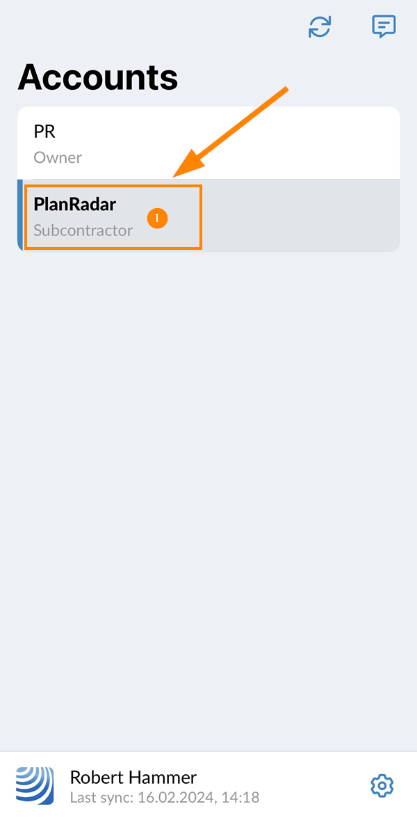 Cuando la sincronización haya finalizado, verás la pantalla de selección de cuenta. Si varias empresas te han invitado a sus cuentas de PlanRadar, aquí puedes seleccionar la cuenta con la que quieres trabajar.