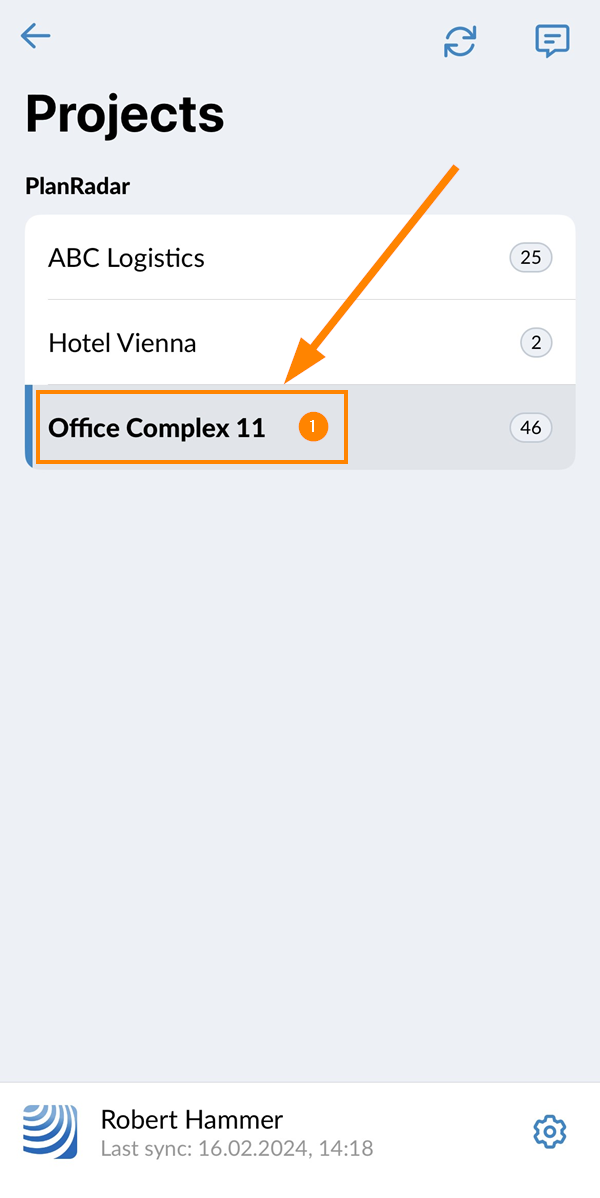 Para iniciar la sincronización de tu dispositivo móvil con el servidor PlanRadar:
