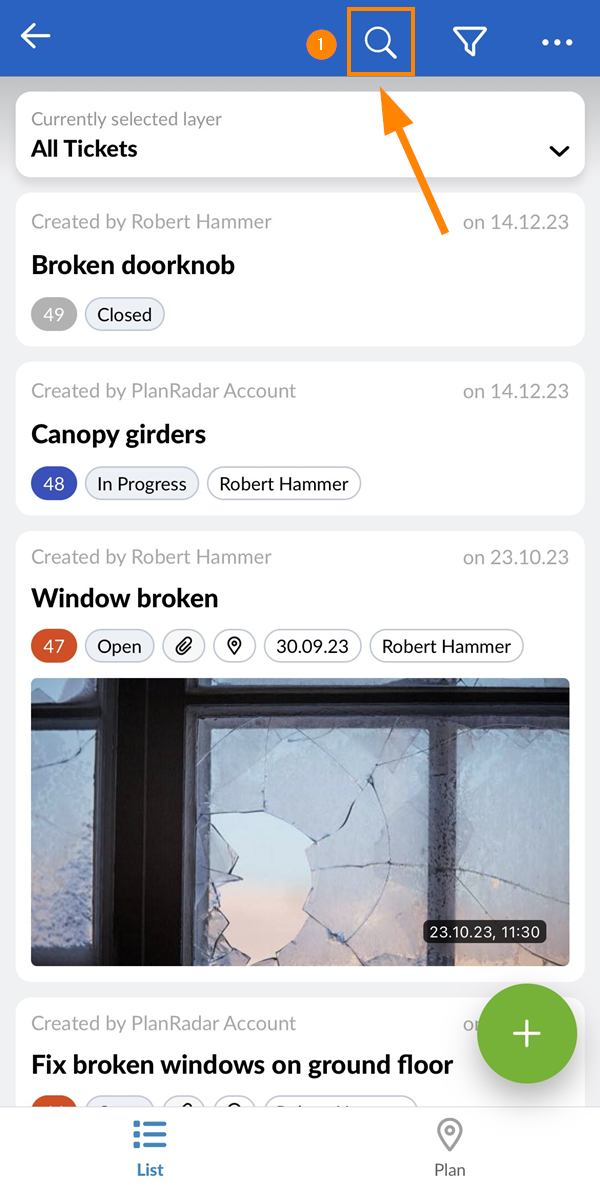 Independientemente de si estás en la vista de lista o en la vista de plano, siempre puedes buscar tickets usando texto. Sólo se mostrarán los tickets que coincidan hasta que canceles la búsqueda.