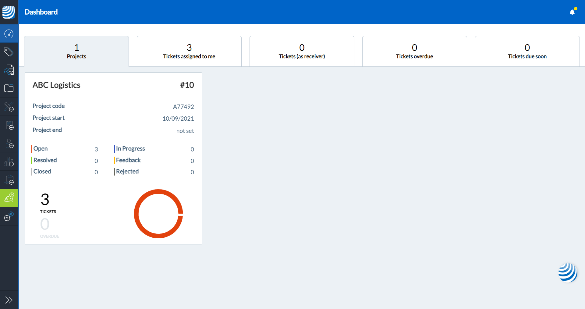 Después de iniciar sesión, empieza en el panel, que te brinda una descripción general de todos tus proyectos y los tickets que te han asignado.