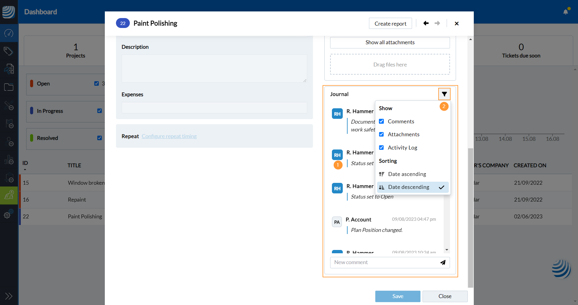 Cuando se cambia la información de un ticket o se envía un comentario, se agrega una entrada al diario (ver segunda captura de pantalla).