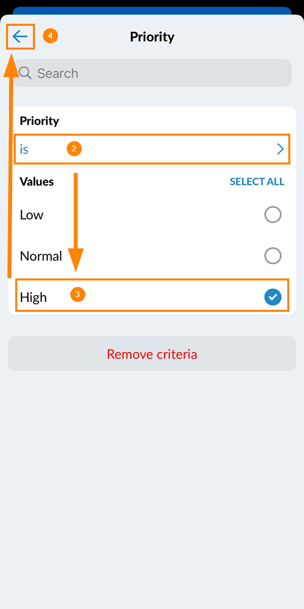 - Haga clic en los criterios de filtrado, por ejemplo Prioridad
