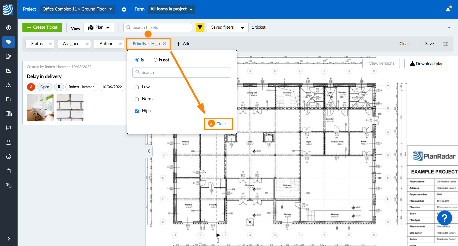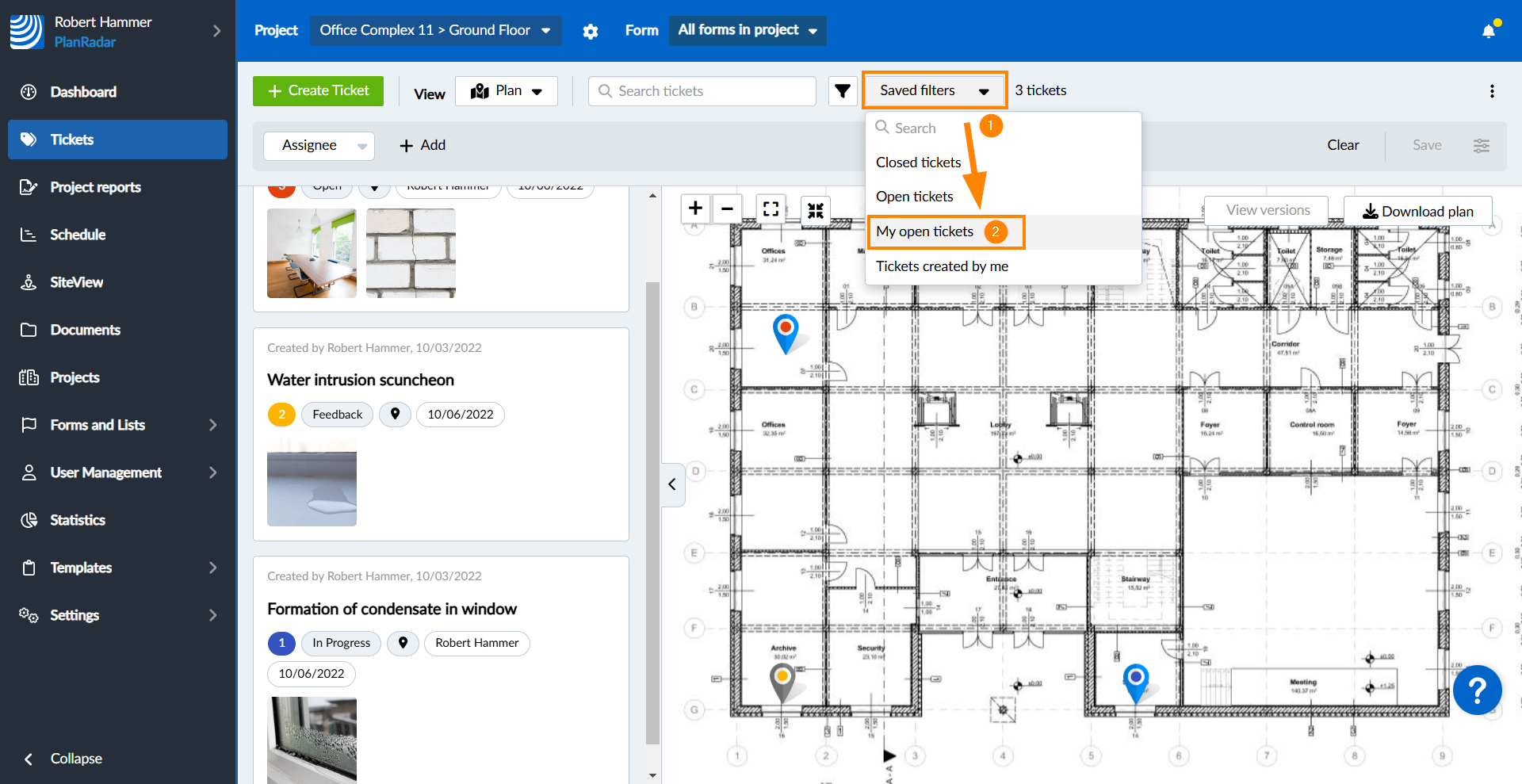 Tenga en cuenta que los filtros se aplican junto con cualquier término de búsqueda y en función de los tickets del proyecto, capa y, en el caso de la Webapp, también del formulario seleccionados.