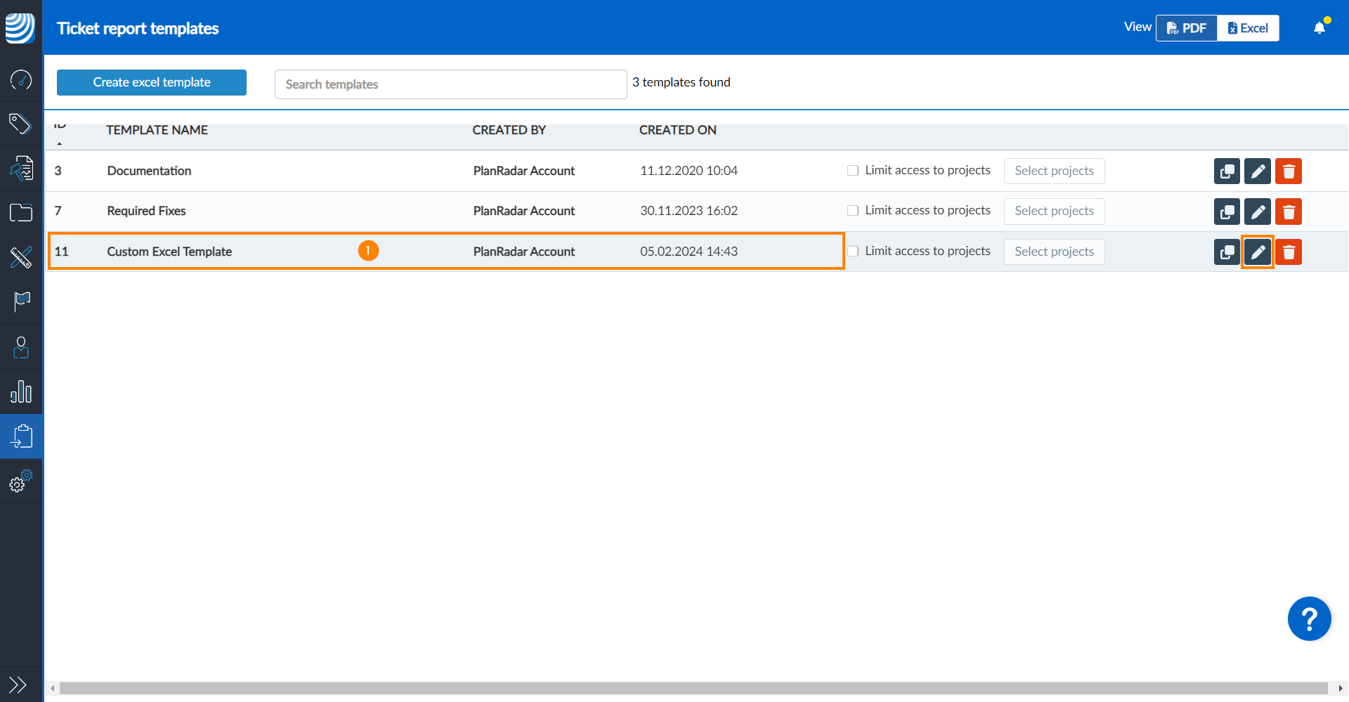 Cree una plantilla Excel para definir cómo debe crearse el archivo Excel y qué datos desea incluir. No obstante, puede Exportar tickets a Excel sin plantilla, lo que generará un archivo Excel tal y como lo defina PlanRadar.