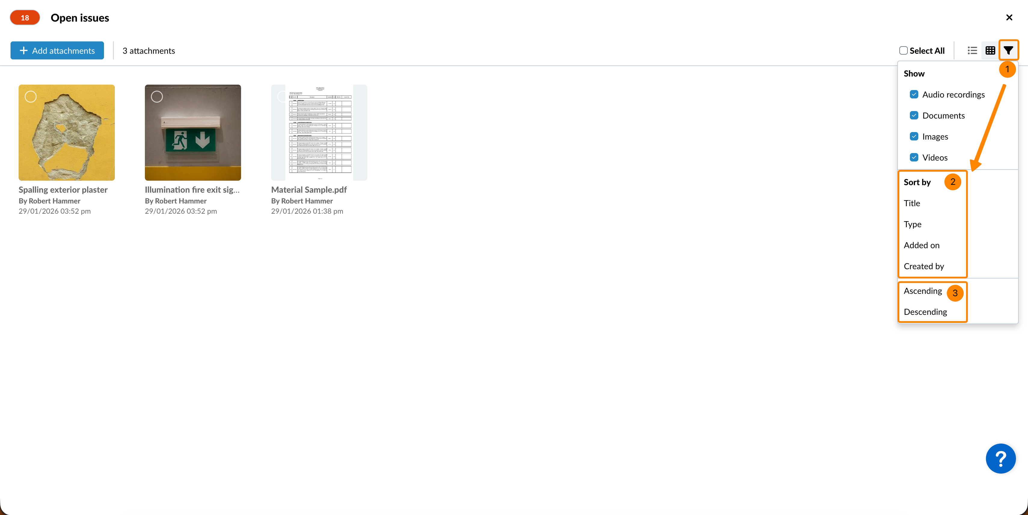 Por defecto, verá los archivos adjuntos en la vista de cuadrícula, incluyendo todos los tipos de archivo y ordenados de forma descendente por la marca de tiempo "Añadido el".