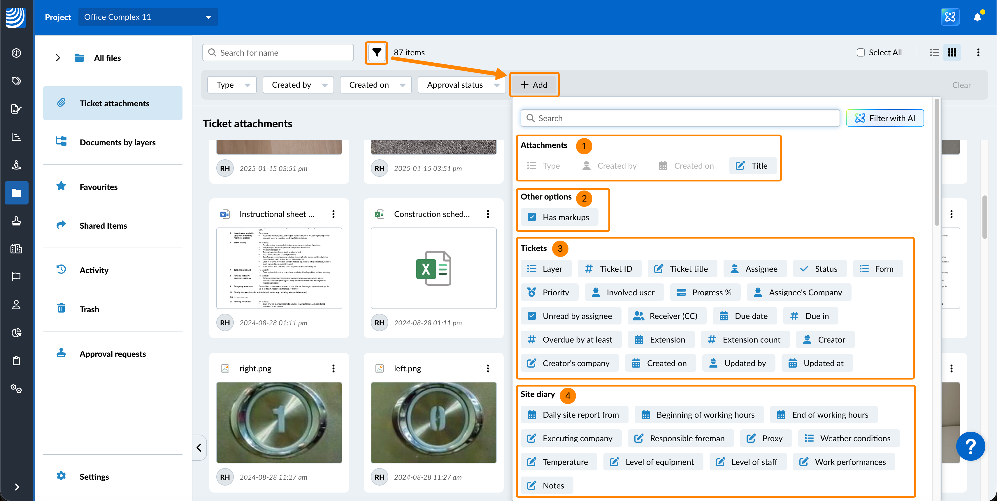 Vea y filtre los archivos adjuntos de todos los tickets de un proyecto en una vista consolidada en la Webapp. Así tendrá una mejor visión de conjunto y no tendrá que abrir cada ticket para acceder a los archivos adjuntos.
