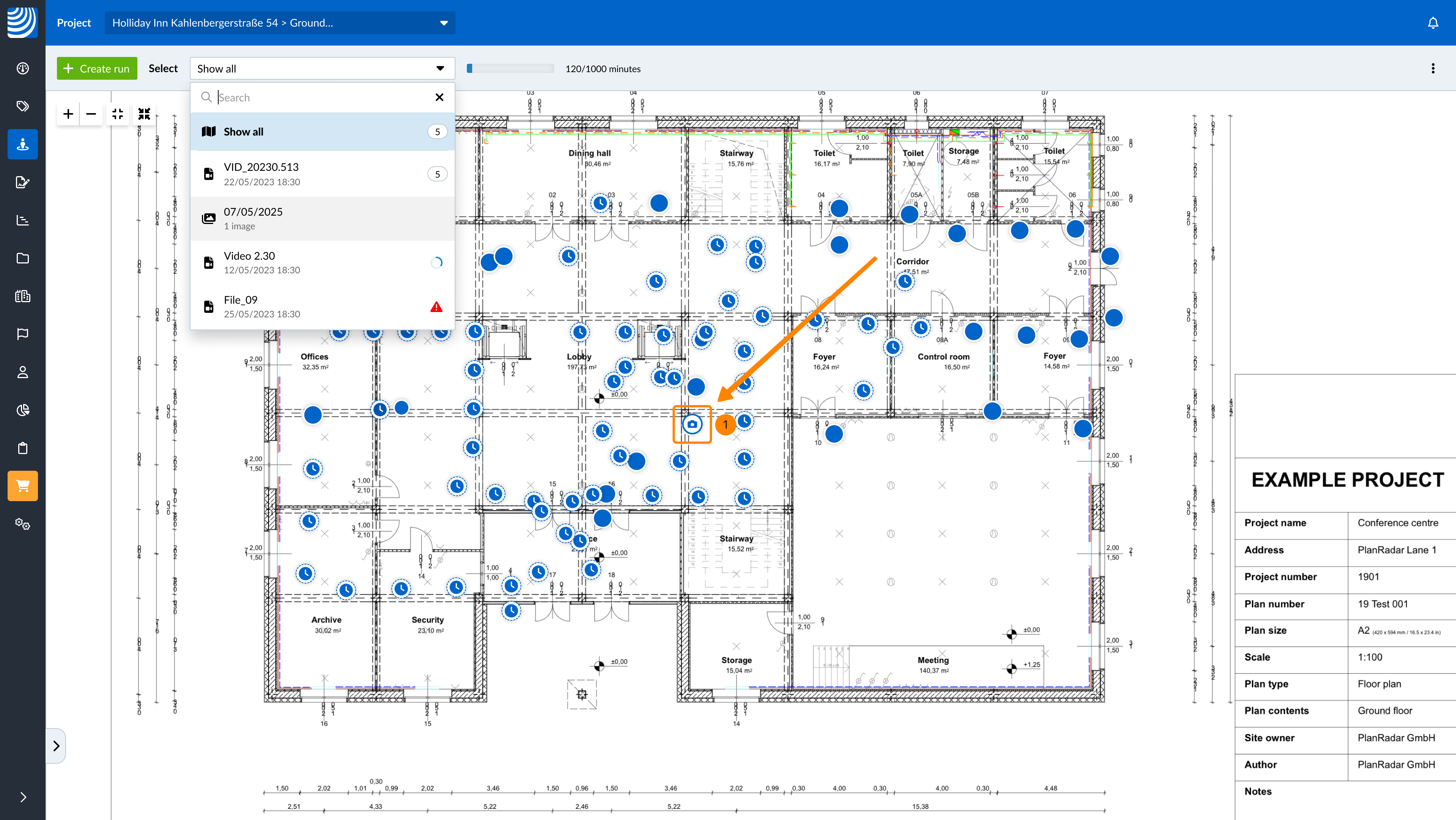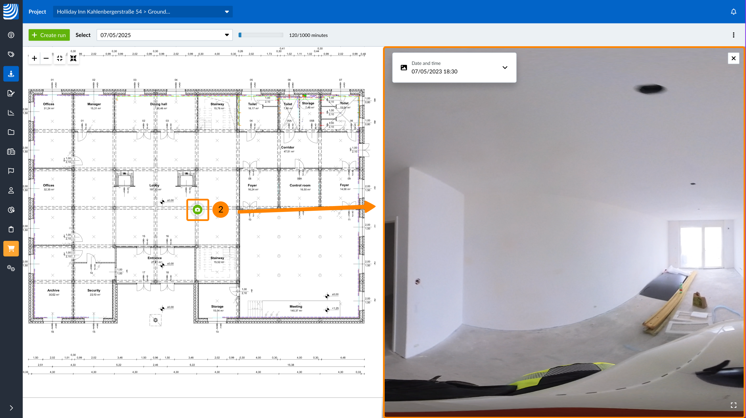 SiteView las imágenes fijas de 360° de alta resolución son fotos que usted toma y coloca en el plano manualmente - son no extraídas de una grabación de vídeo de una carrera. (Consulte también Crear un recorrido con la aplicación móvil PlanRadar ).