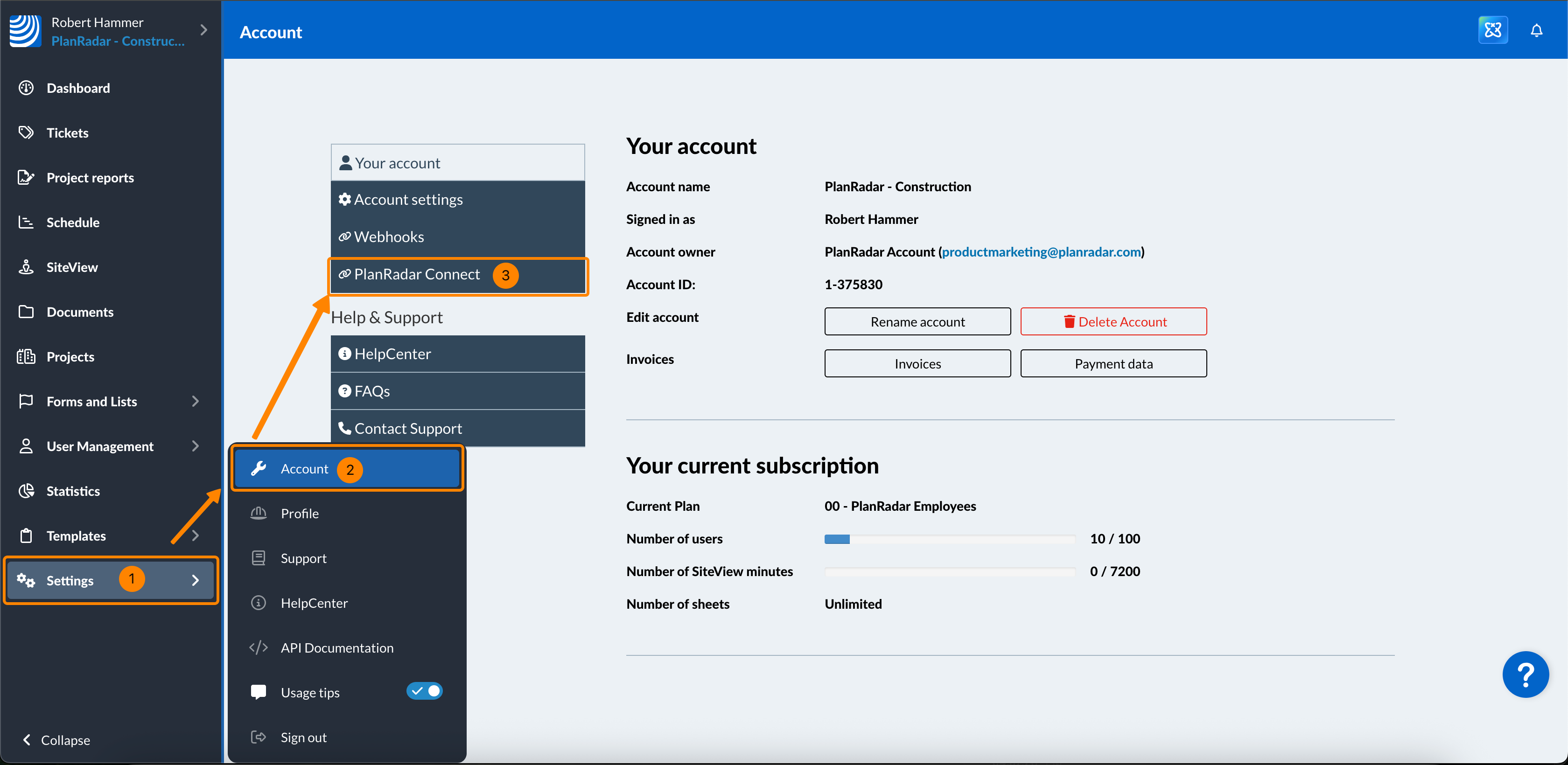 Para acceder a PlanRadar Connect, necesita un usuario interno con el permiso de usuario "Cuenta". Más información en Permisos.