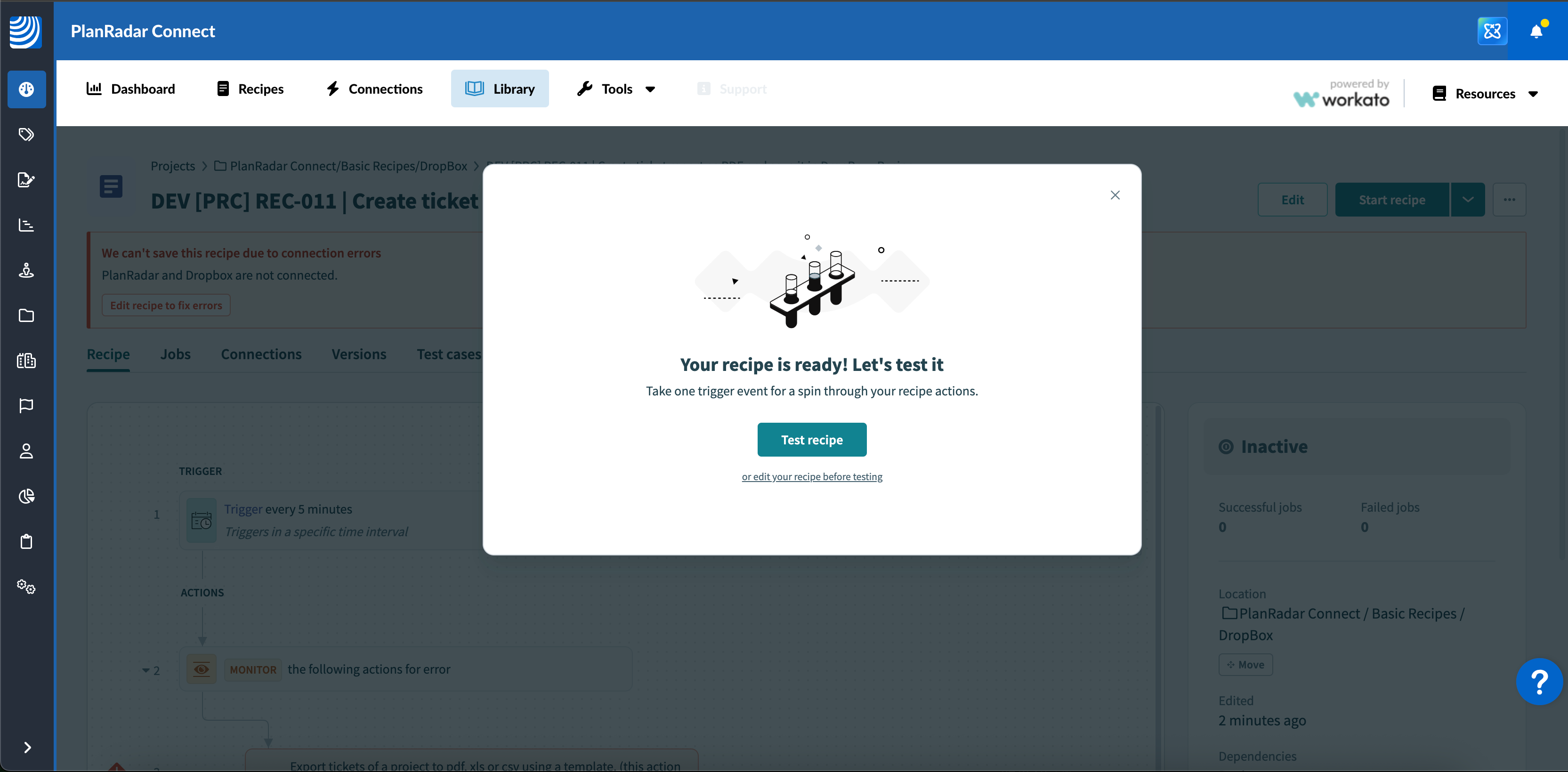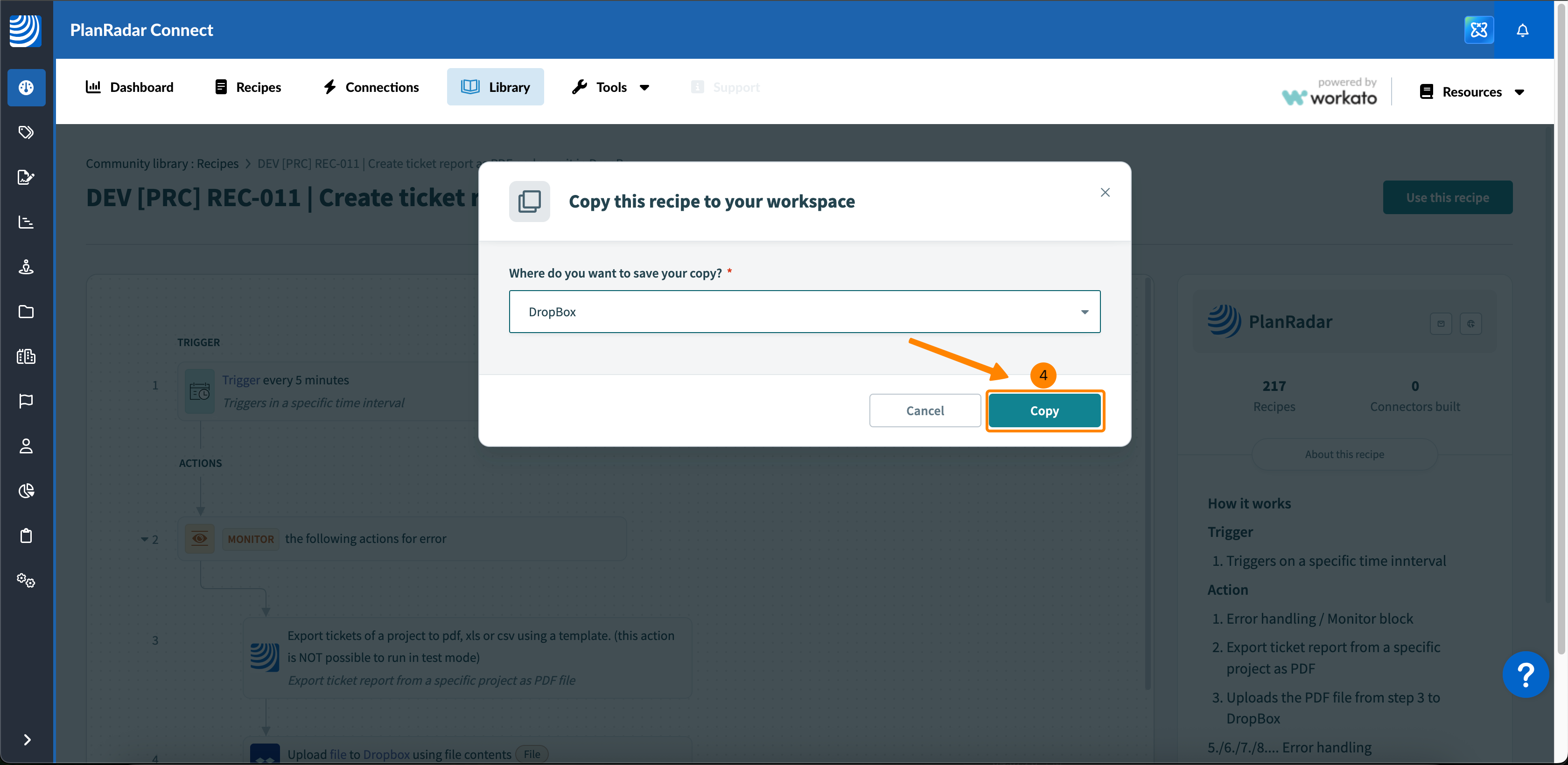 - Elija dónde desea guardar la receta, por ejemplo, en PlanRadar Connect > Recetas básicas > Dropbox