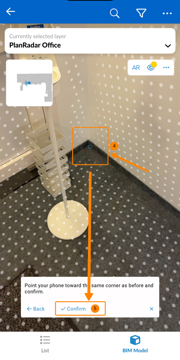 Apunte con su dispositivo móvil hacia la misma esquina física que seleccionó como primer punto. - Pulse Confirmar