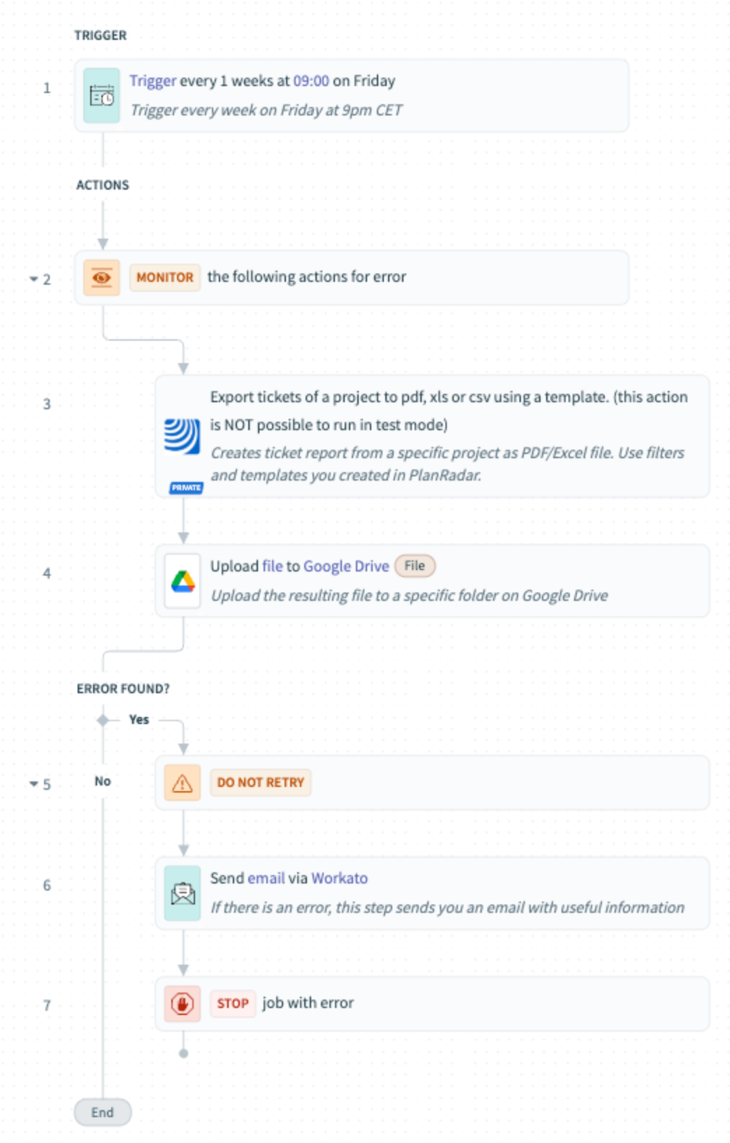 Esta receta programada exporta los datos de ticket como un archivo Excel (.xls) desde PlanRadar y los guarda en una carpeta designada de Google Drive. Es la mejor para exportaciones recurrentes de datos a plataformas externas.