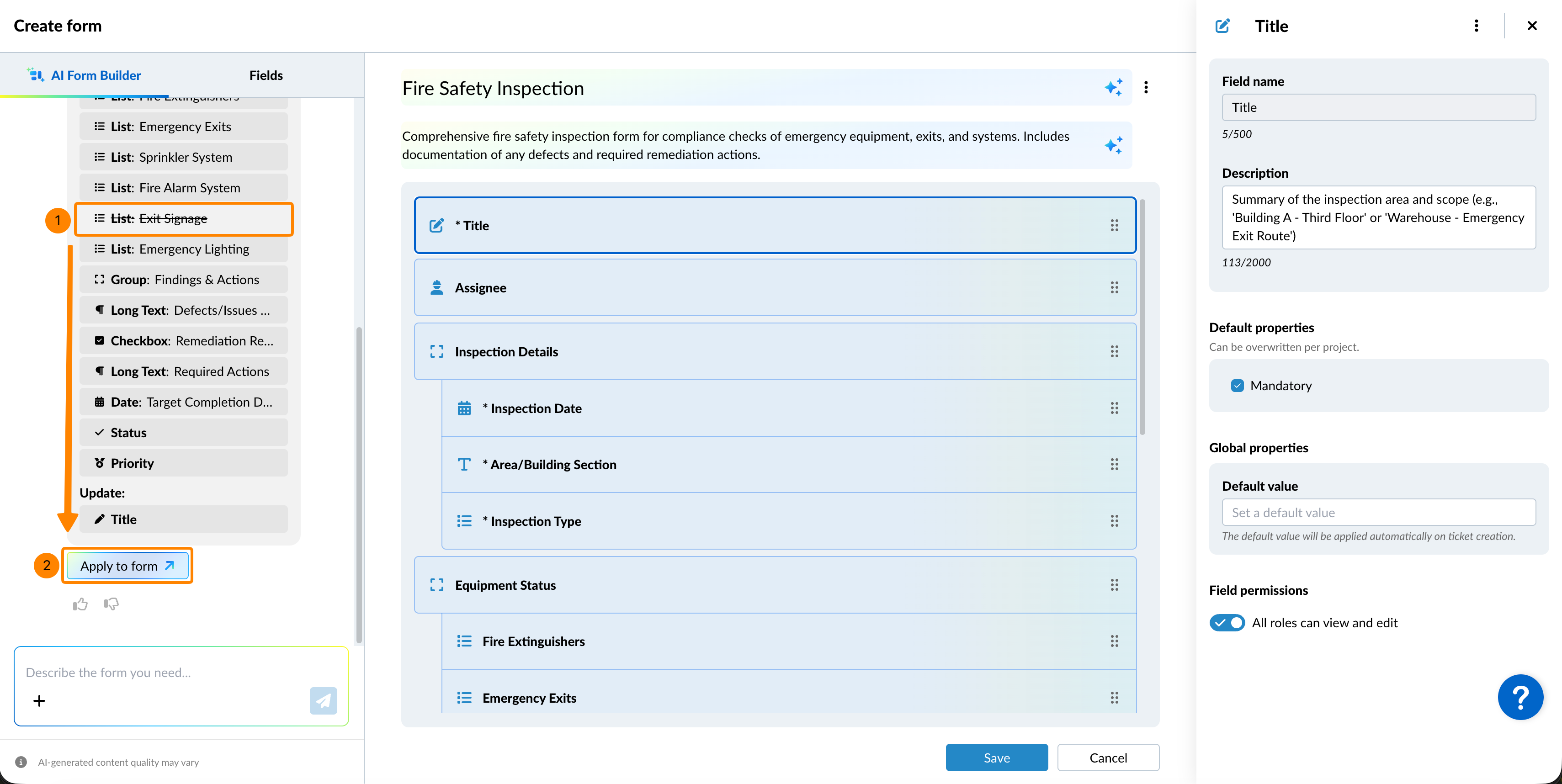 Cuando la IA aplica cambios, los campos creados y editados se resaltan con un borde de color para que pueda identificar y revisar el contenido generado por la IA. El resaltado se elimina cuando edita el campo manualmente o cuando guarda el formulario.
