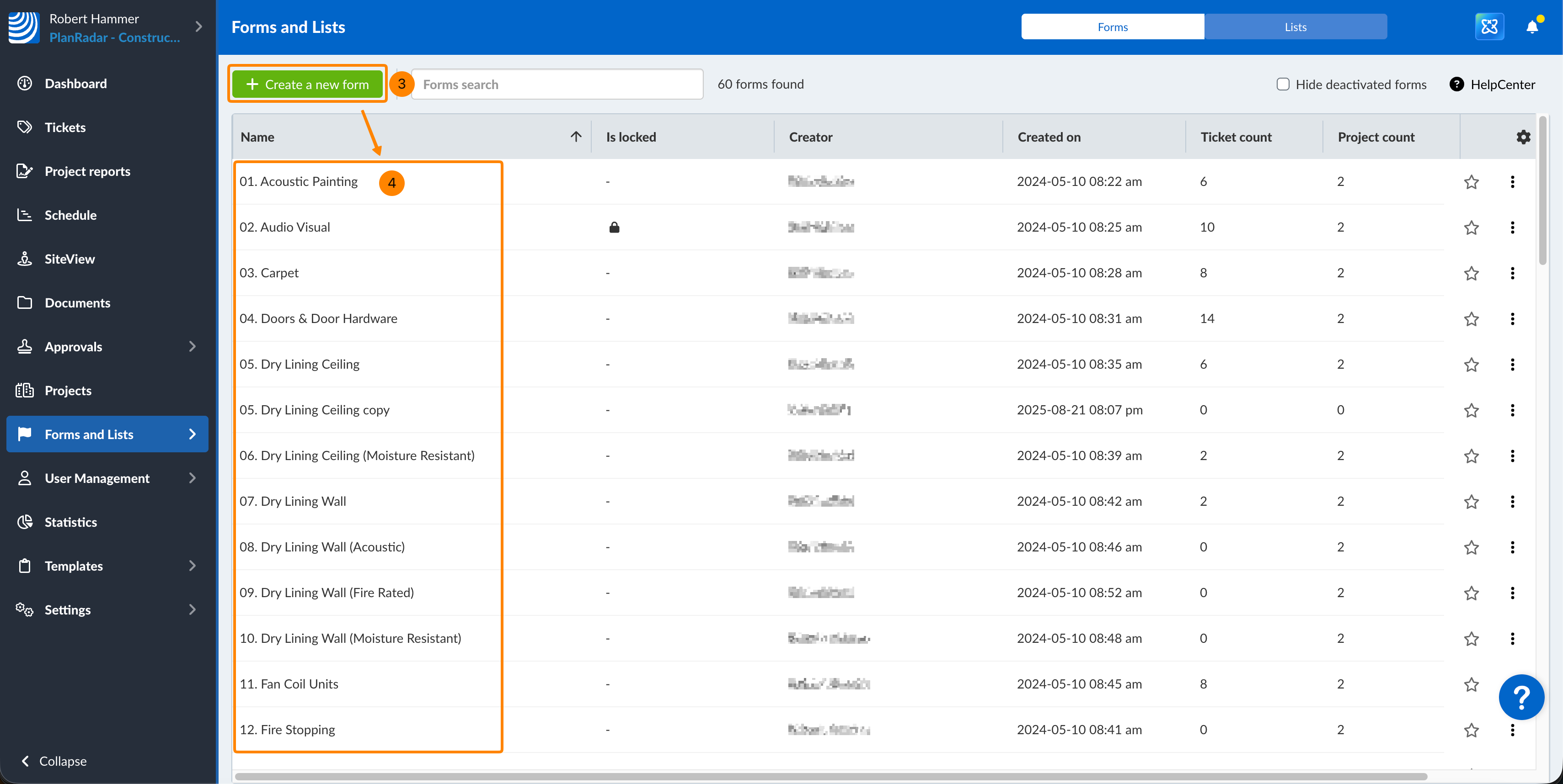 | Formulario | Nombre, descripción y configuración: anexos, comentarios, posición en el plano, geolocalización, actividad recurrente, bloqueo, secuencia de numeración, firmas y flujos de trabajo de aprobación. |