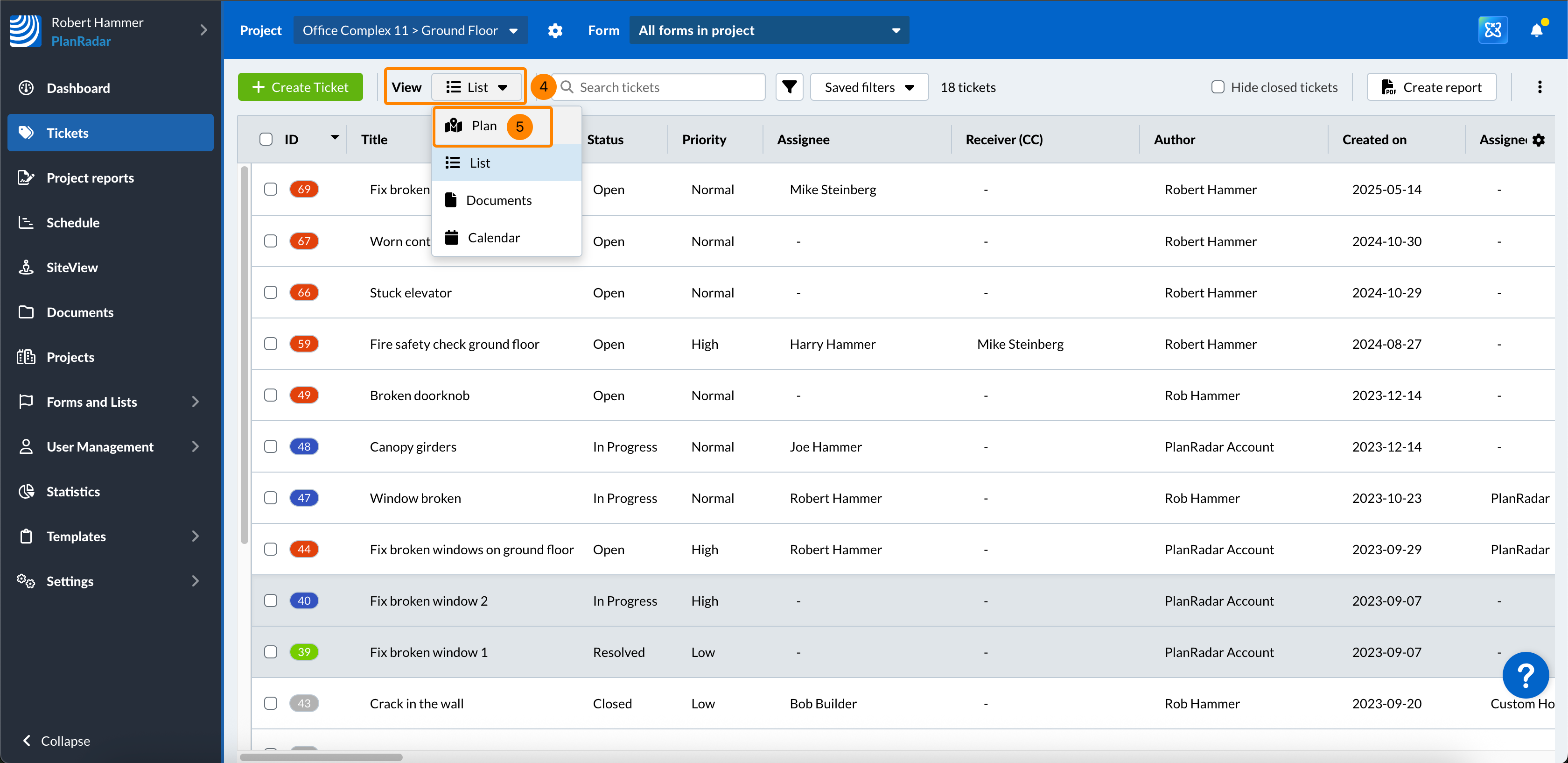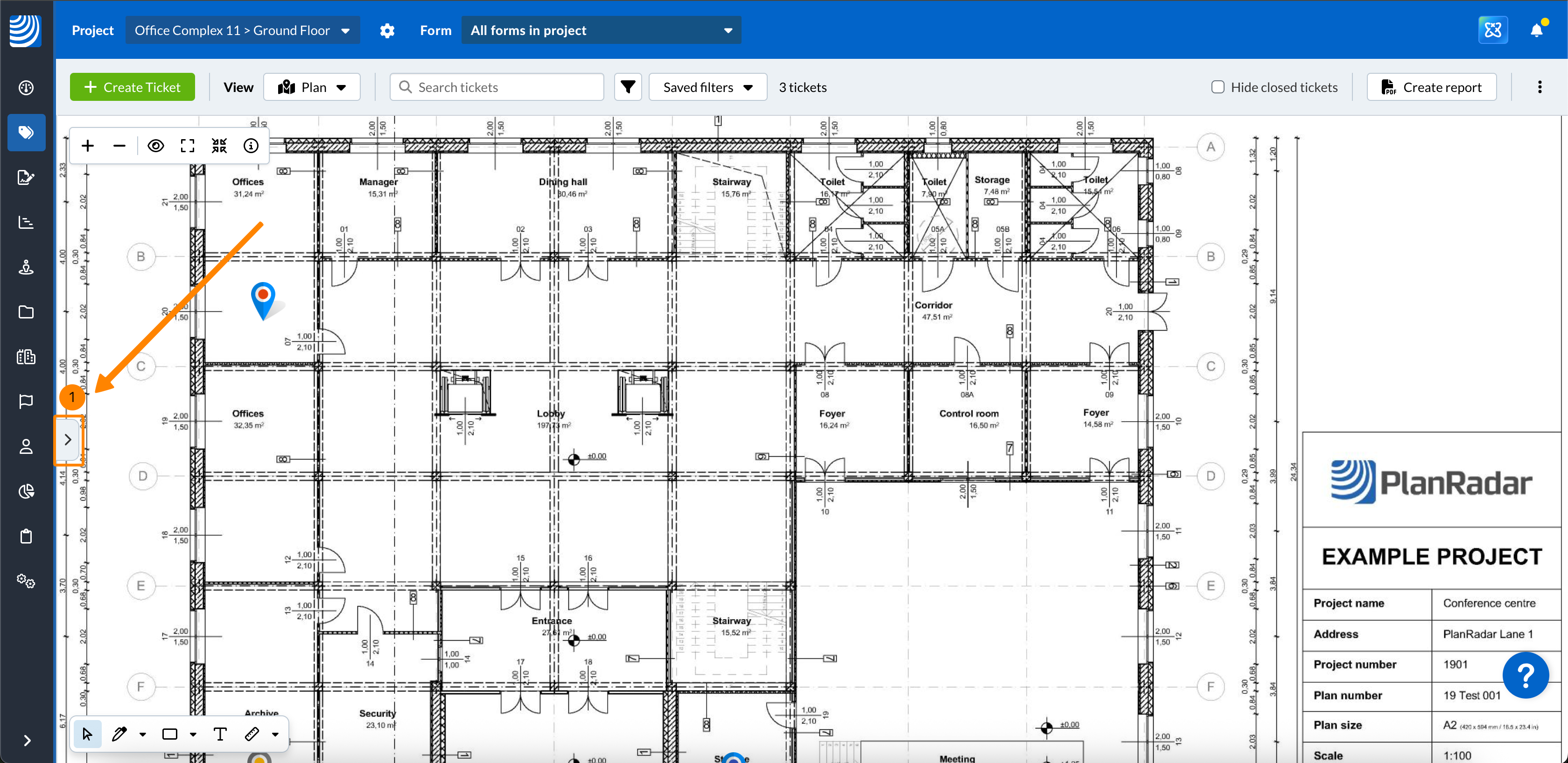 - Cliquez sur le billet dans la liste des billets pour afficher automatiquement l'épingle du billet sur le plan et ouvrir l'aperçu du billet.