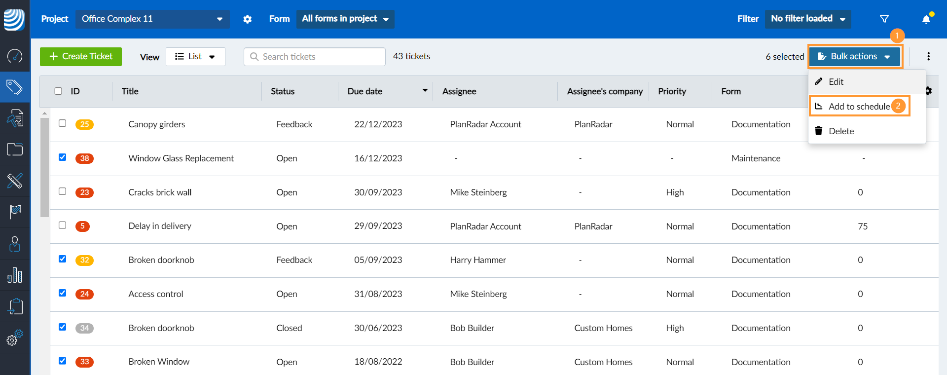 Dans la vue de la liste des tickets, vous pouvez sélectionner plusieurs tickets. Cela vous permet de les modifier ou de les supprimer, de créer un rapport de ticket ou de les ajouter à votre planning.