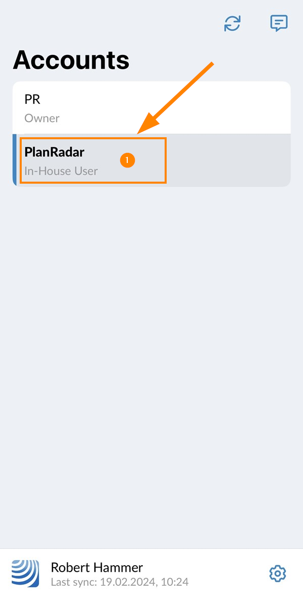 Lorsque la synchronisation est terminée, l'écran de sélection du compte s'affiche. Si plusieurs entreprises vous ont invité(e) à accéder à leurs comptes PlanRadar, vous pouvez sélectionner le compte avec lequel vous souhaitez travailler.