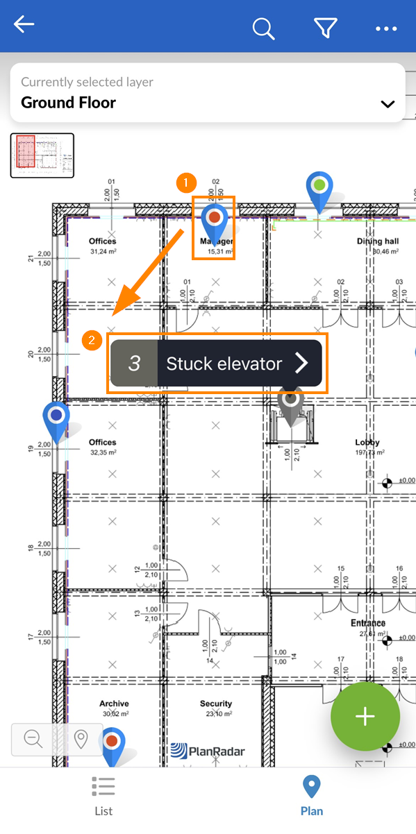 À gauche, vous voyez une liste de tâches et à droite, le plan. Les pastilles indiquent la position des tâches sur le plan.