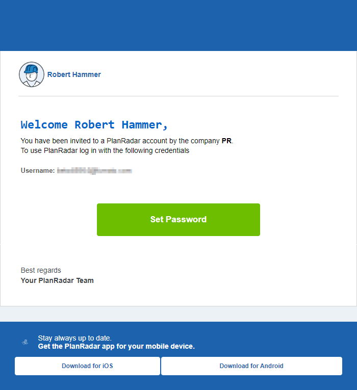 Lorsque vous êtes invité, vous recevez un e-mail d'invitation de PlanRadar avec votre nom d'utilisateur et un lien pour définir votre mot de passe. L'e-mail d'invitation contient également des liens pour télécharger l'application mobile.