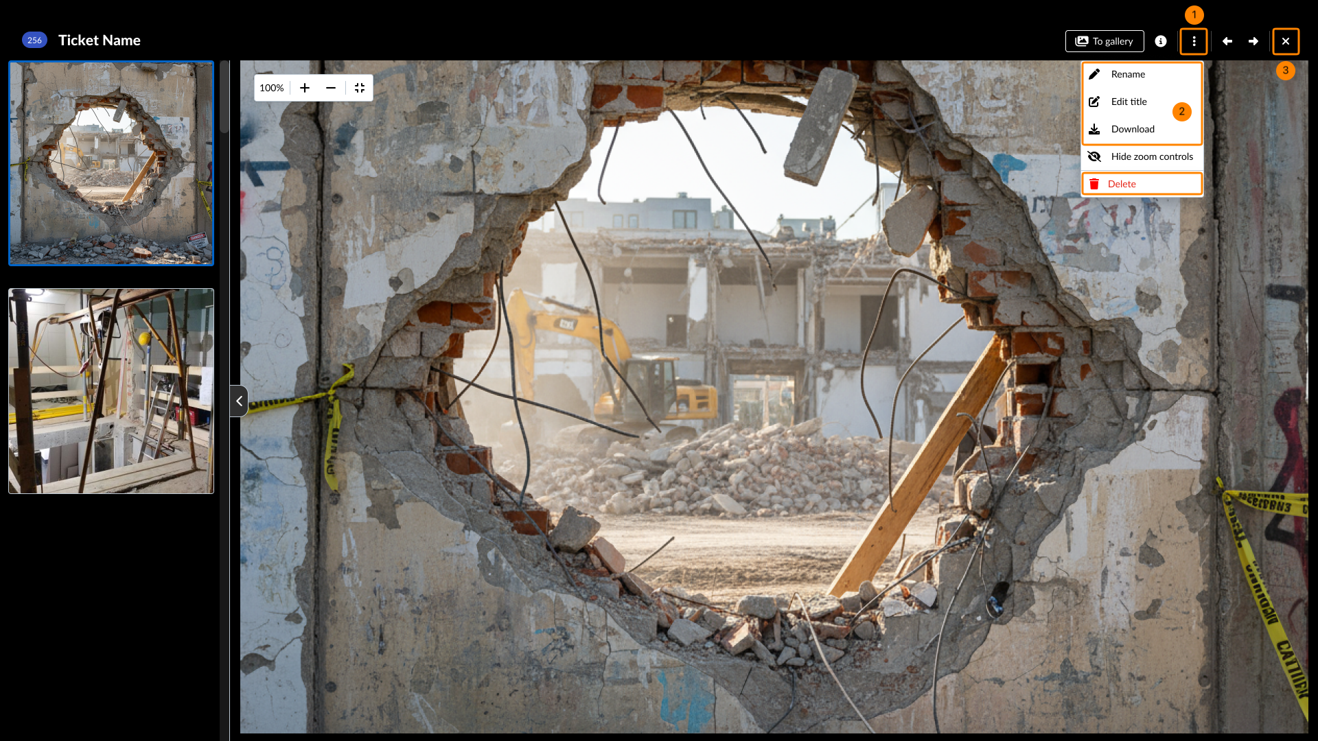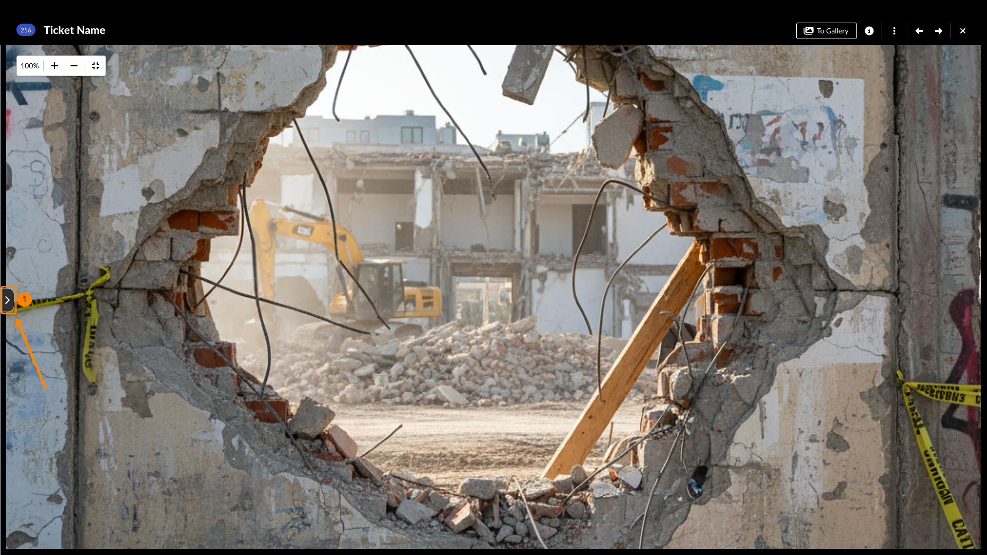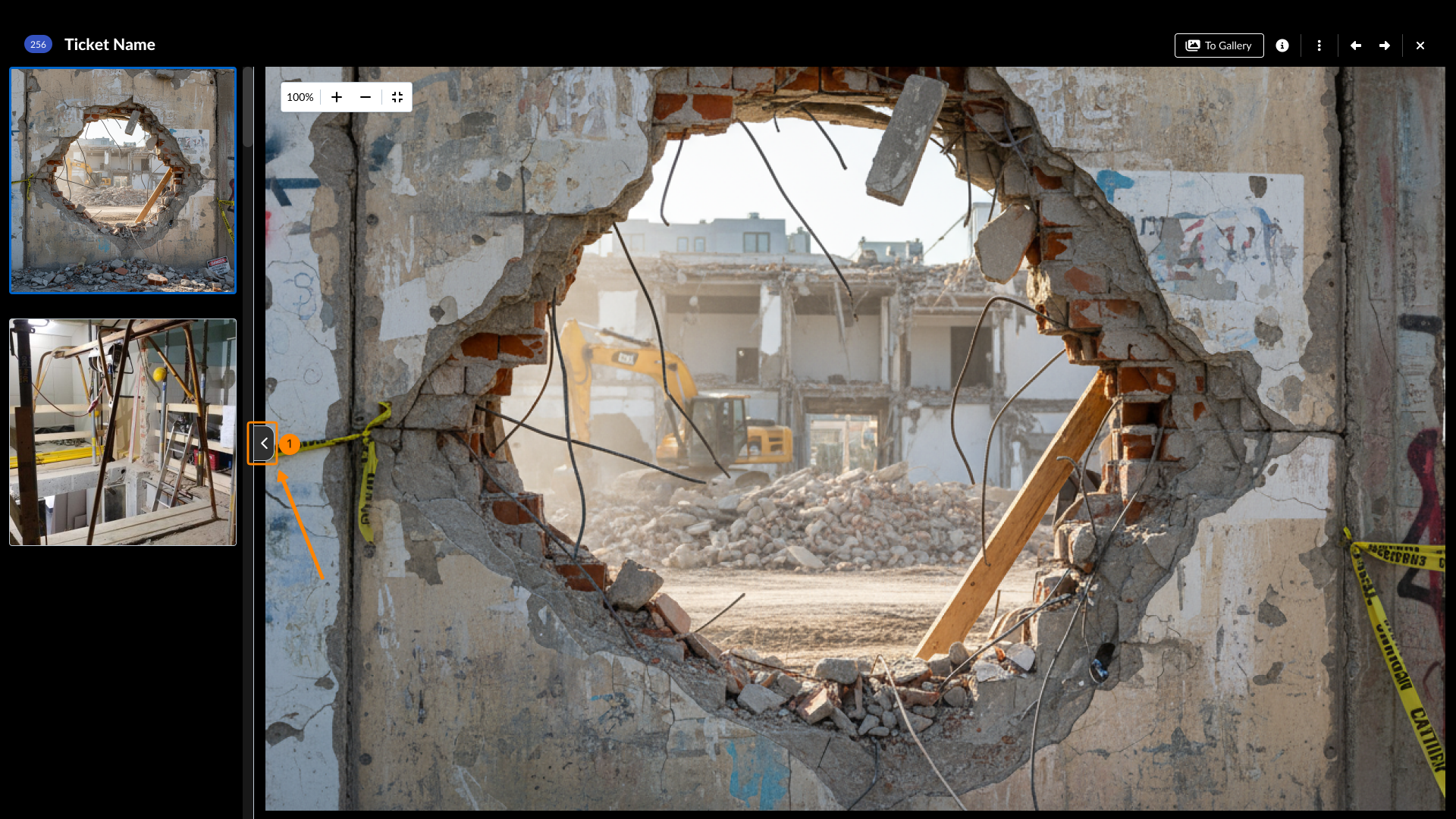 Lorsque vous visitez View & Edit a Ticket, vous pouvez rapidement visualiser les pièces jointes en cliquant sur les vignettes pour ouvrir la visionneuse de pièces jointes pour les médias (photos et vidéos) ou pour les PDF. Vous pouvez visualiser toutes les pièces jointes du champ ou les pièces jointes générales dans des galeries séparées.