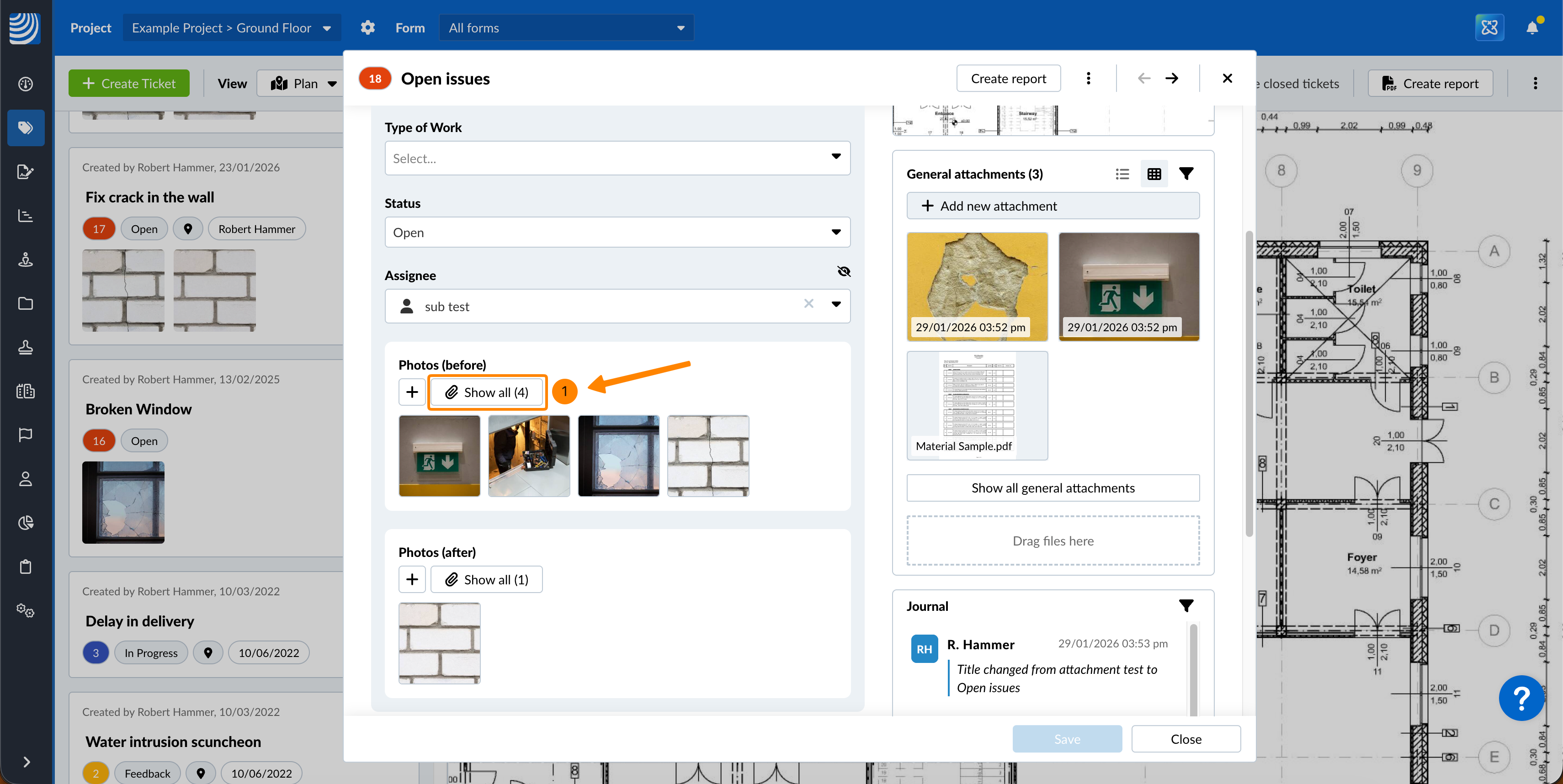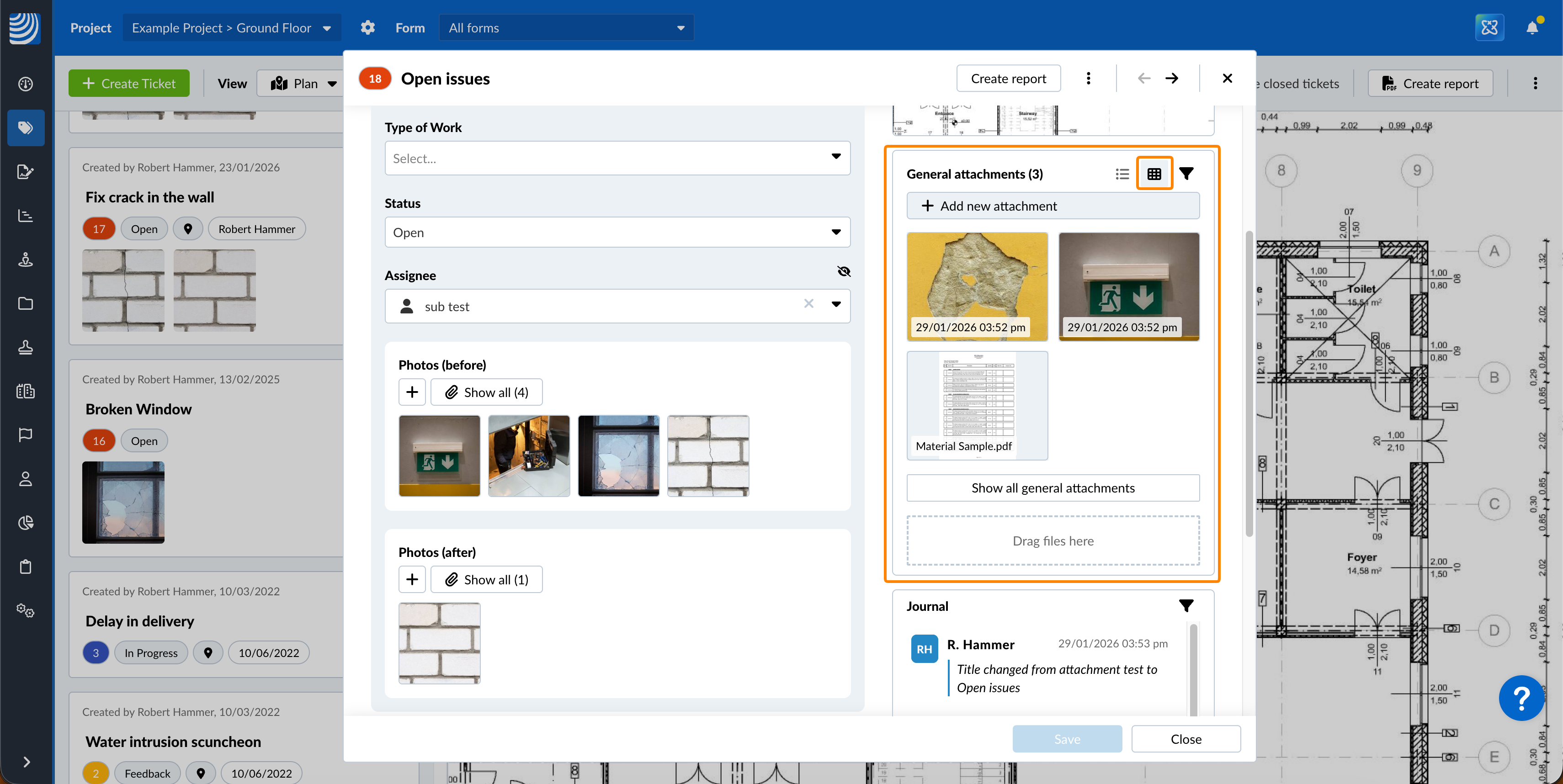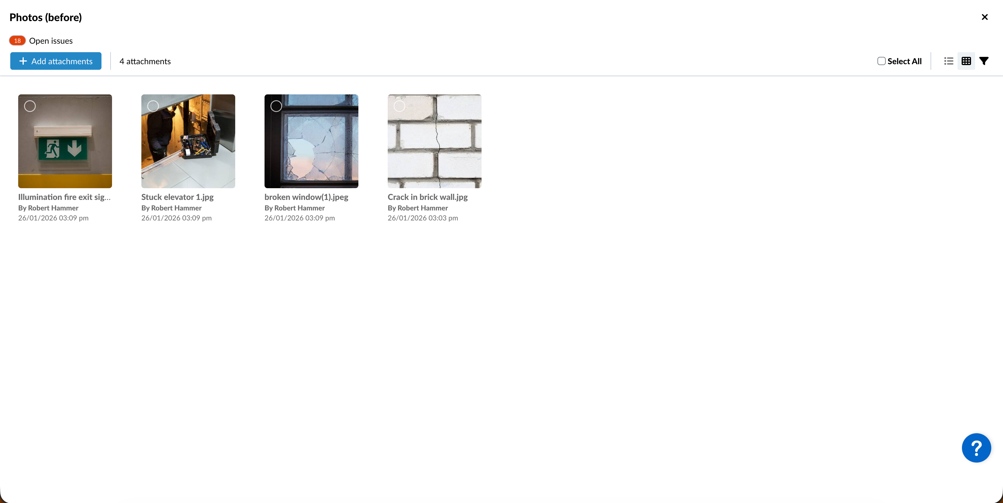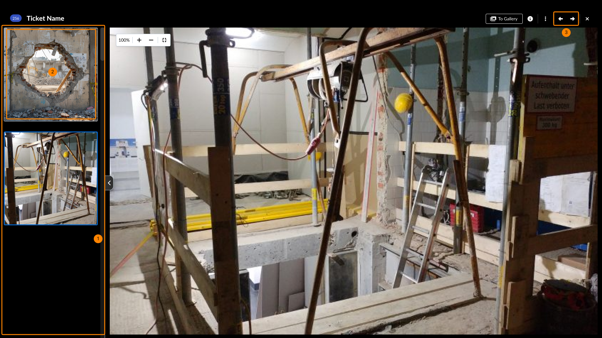 Lorsque vous visitez View & Edit a Ticket, vous pouvez rapidement visualiser les pièces jointes en cliquant sur les vignettes pour ouvrir la visionneuse de pièces jointes pour les médias (photos et vidéos) ou pour les PDF. Vous pouvez visualiser toutes les pièces jointes du champ ou les pièces jointes générales dans des galeries séparées.