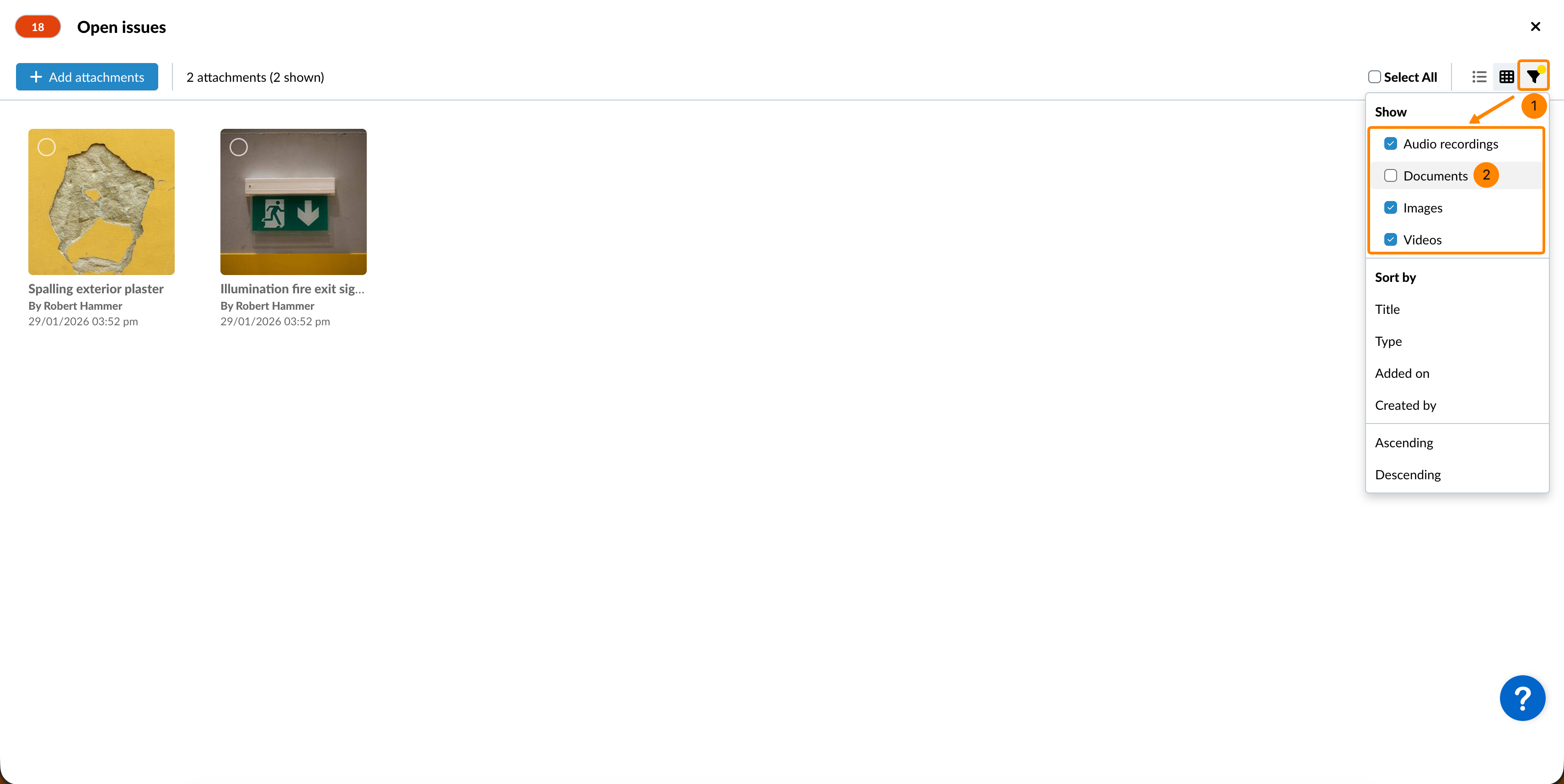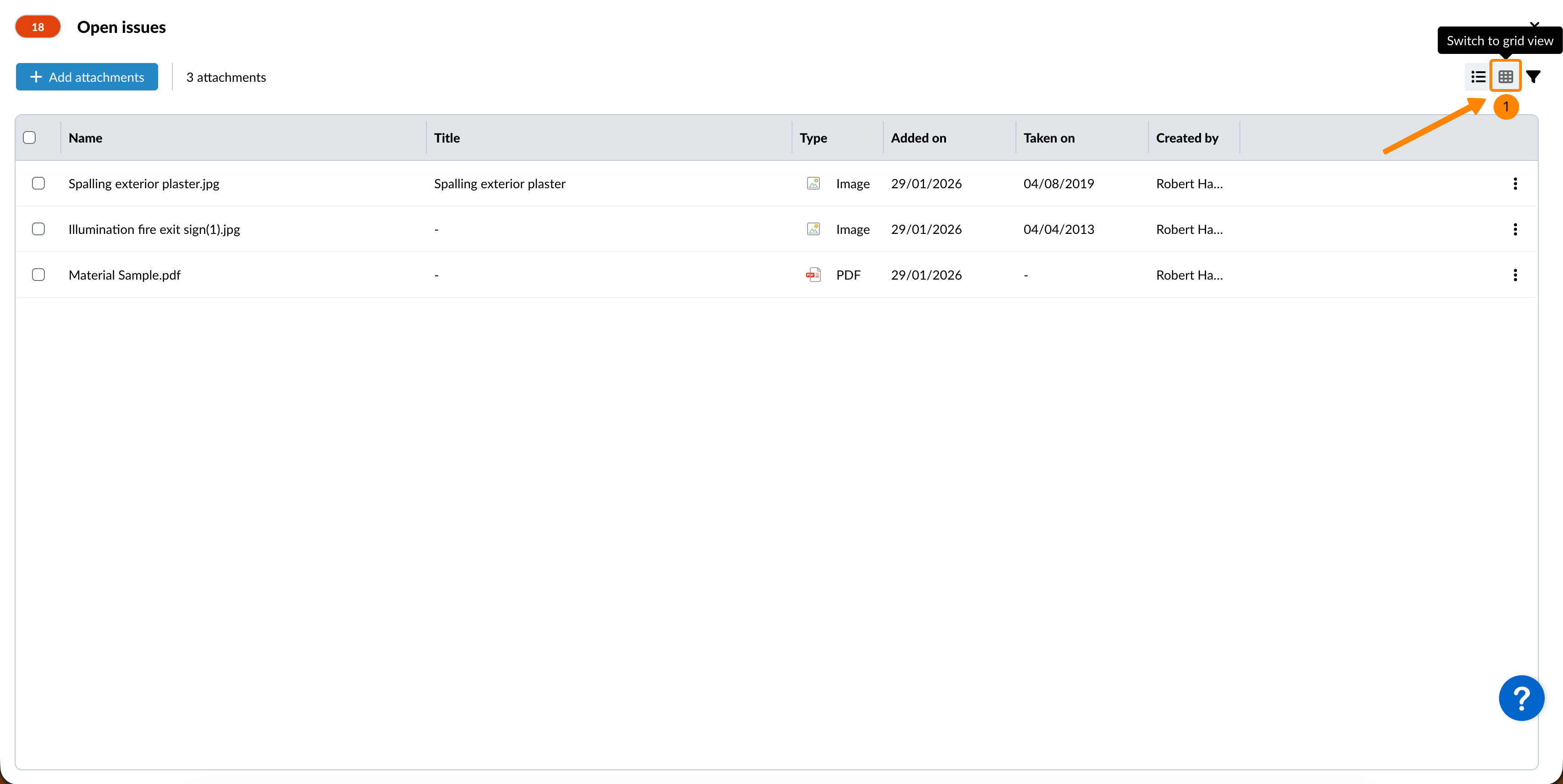 Par défaut, les pièces jointes s'affichent dans la grille, y compris tous les types de fichiers, et sont triées par ordre décroissant de l'horodatage "Ajouté le".